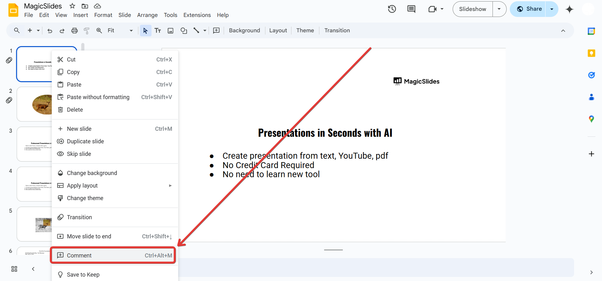 Right-click on the selected slide or object and choose "Comment" from the menu. Alternatively, click the comment icon (💬) in the top-right corner.