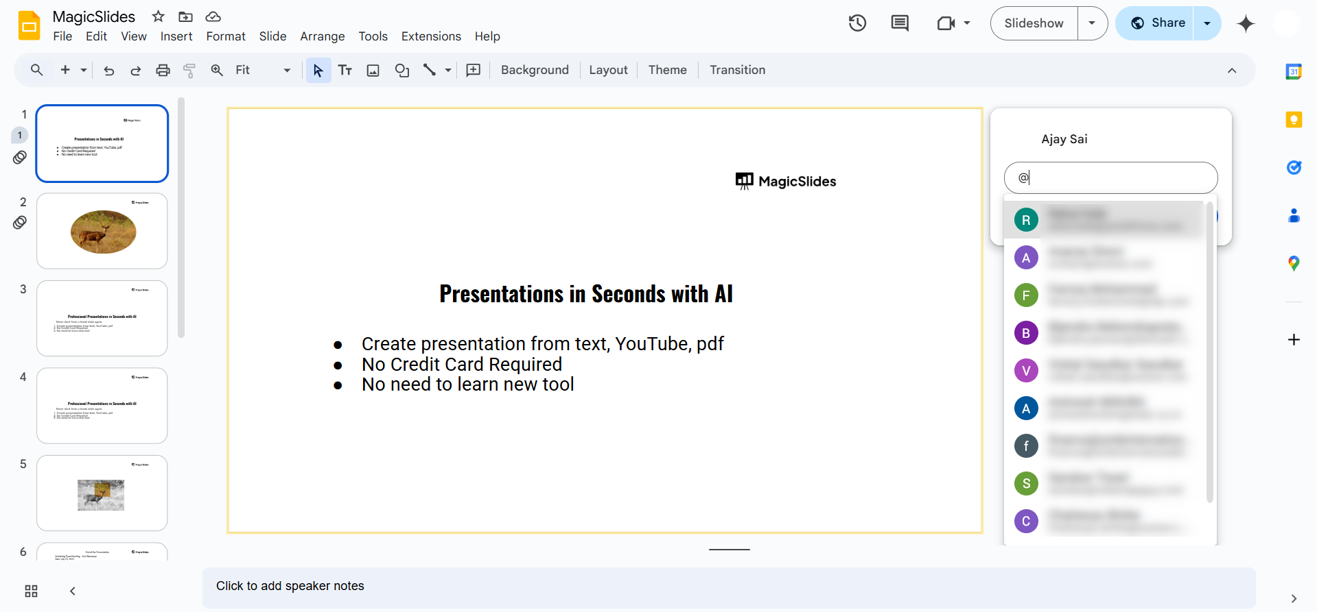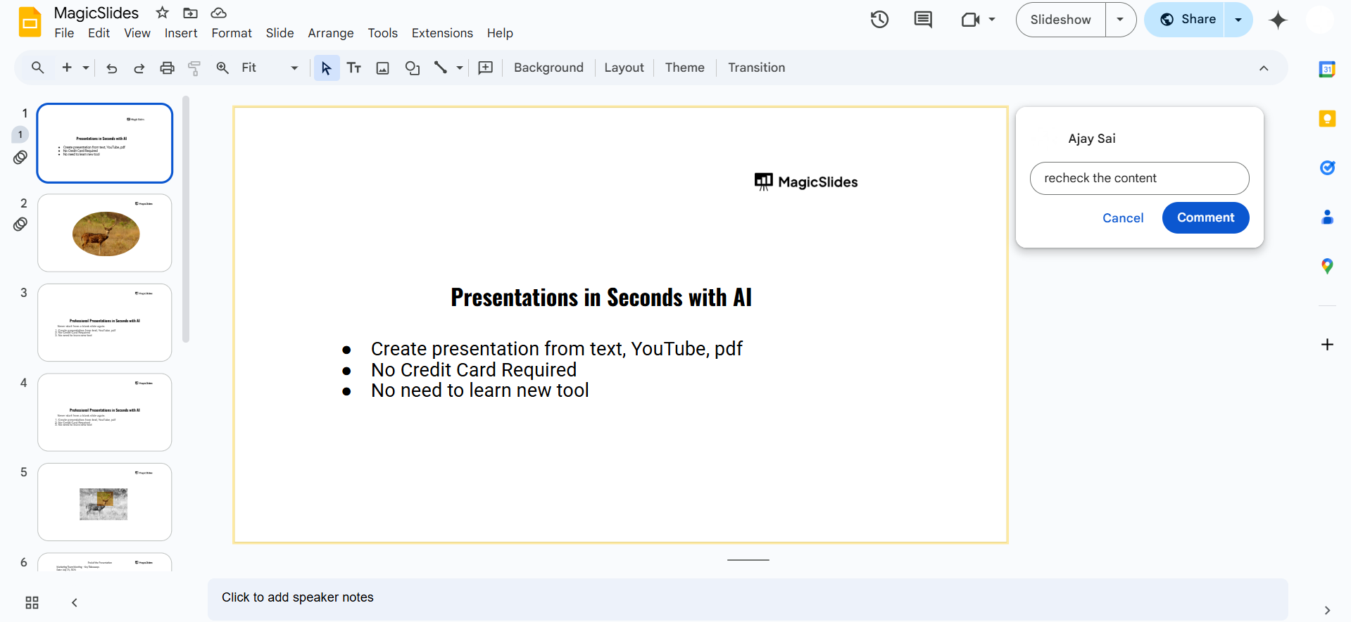 Adding notes for editing in Google Slides is useful for collaboration, but if you want to streamline your entire presentation process, try MagicSlides.app. It helps you generate structured, professional slides effortlessly!