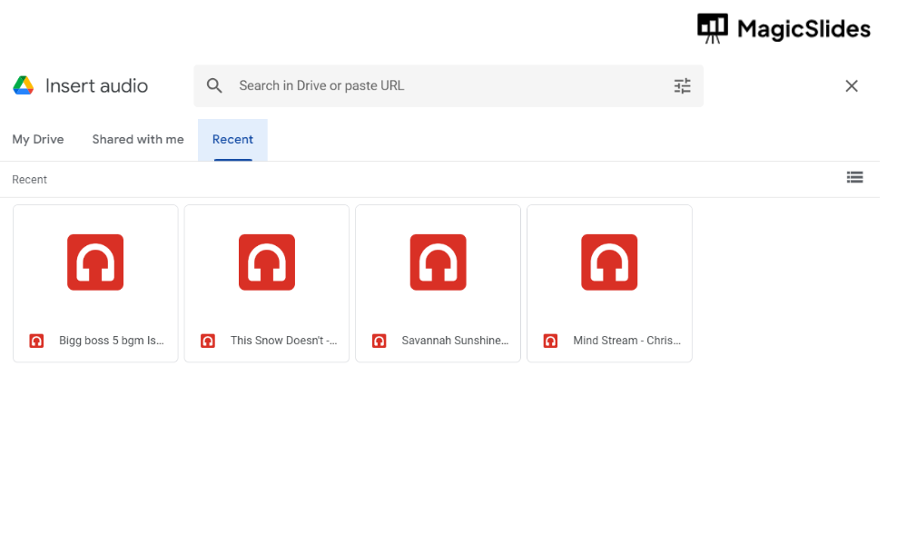 Step 5: Search and Select Your Audio File Use the search bar to find your audio file in Google Drive. Once you locate it, click to select it.