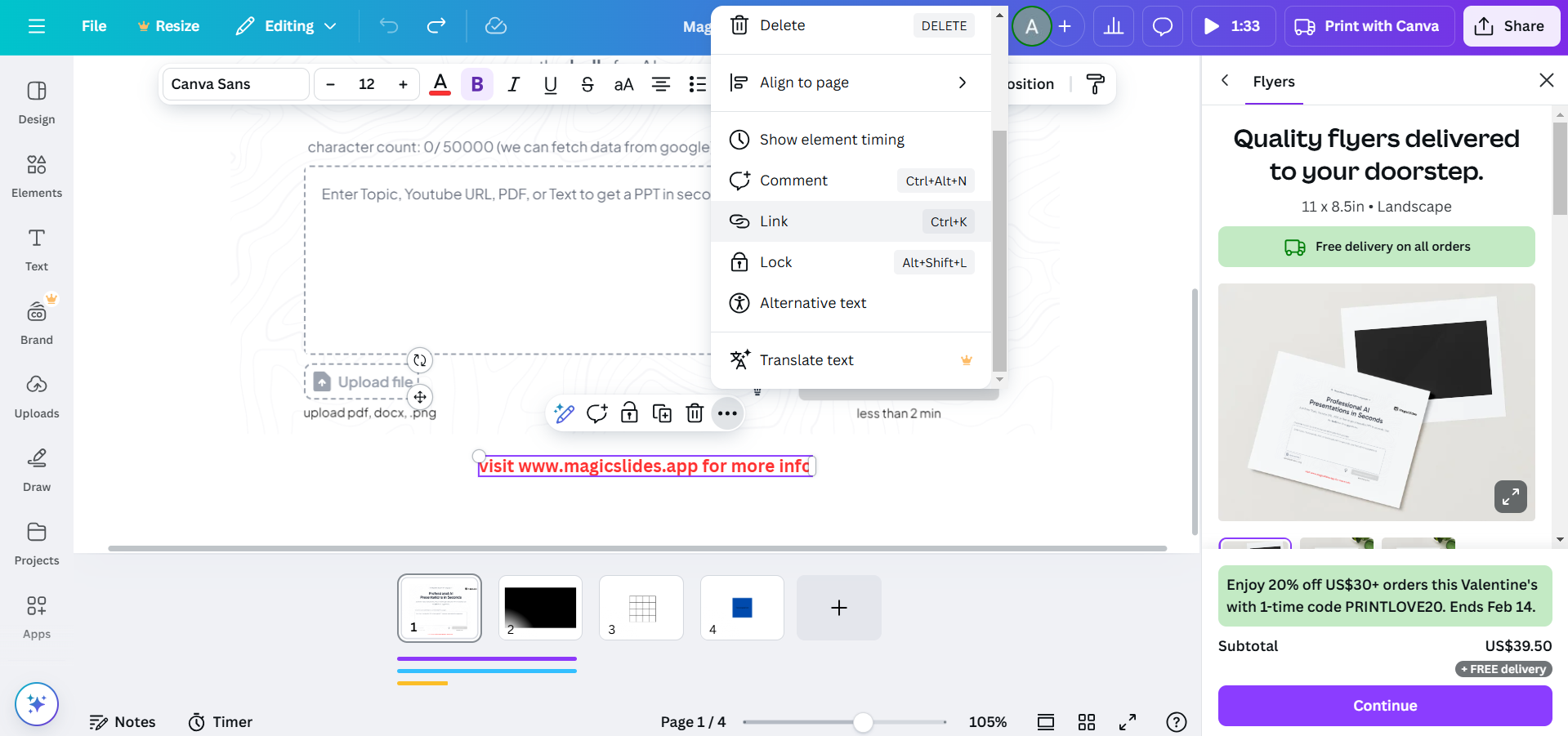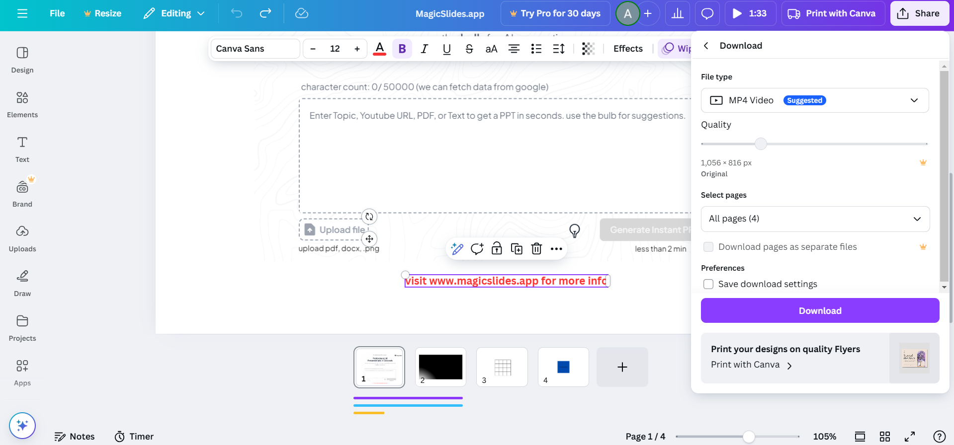 Adding a Spotify song to Canva can enhance your designs, but if you need to create full AI-powered presentations with engaging visuals and structure, check out MagicSlides.app generate professional slides in seconds!