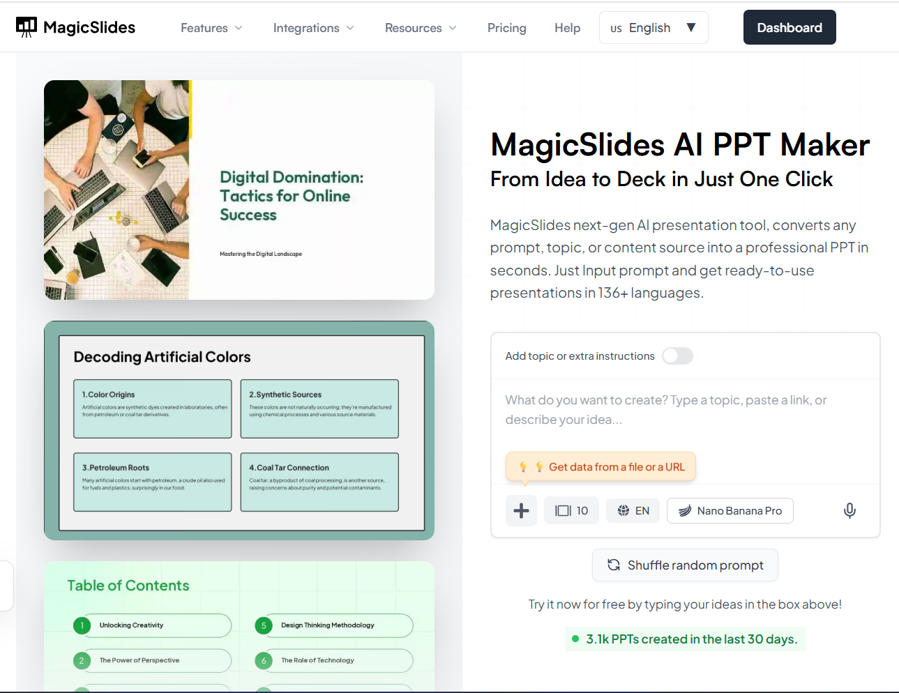 Instead of typing sections one by one, the tool analyses your prompt and generates a perfect PPT with a table of contents, images, and whatever your needs. This directly solves common issues users face while learning how to create a table of contents in PPT, such as:
