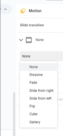From the dropdown, select "Transition" to enter the transition settings for that particular slide.