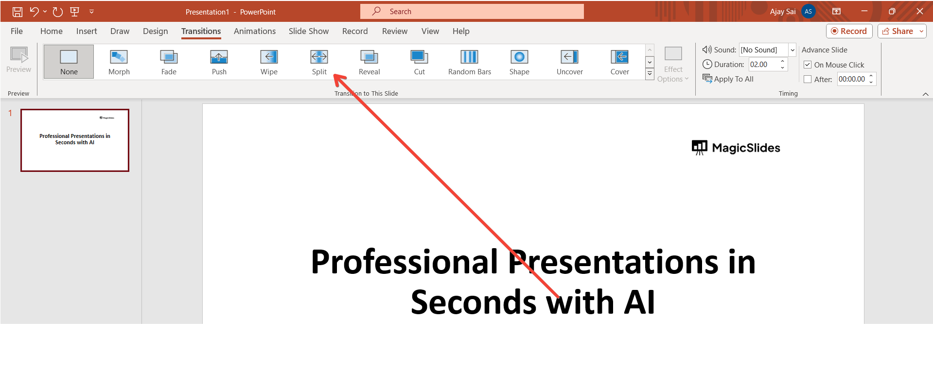 Click on the slide where you want to apply the split transition effect.