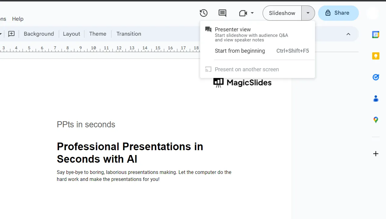 If yes, then setting up autoplay is time-consuming if you do it manually. For the same, I use MagicSlides AI PPT Generator because it saves time formatting and creating professional slides. It simply gives you a ready-made Google Slides file that you can edit like any normal presentation.