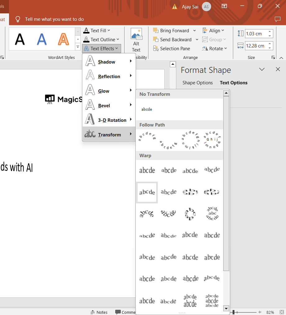 In the Text Effects menu, locate and click on "Transform" or "Warp Text." This option allows you to choose various text-bending effects.