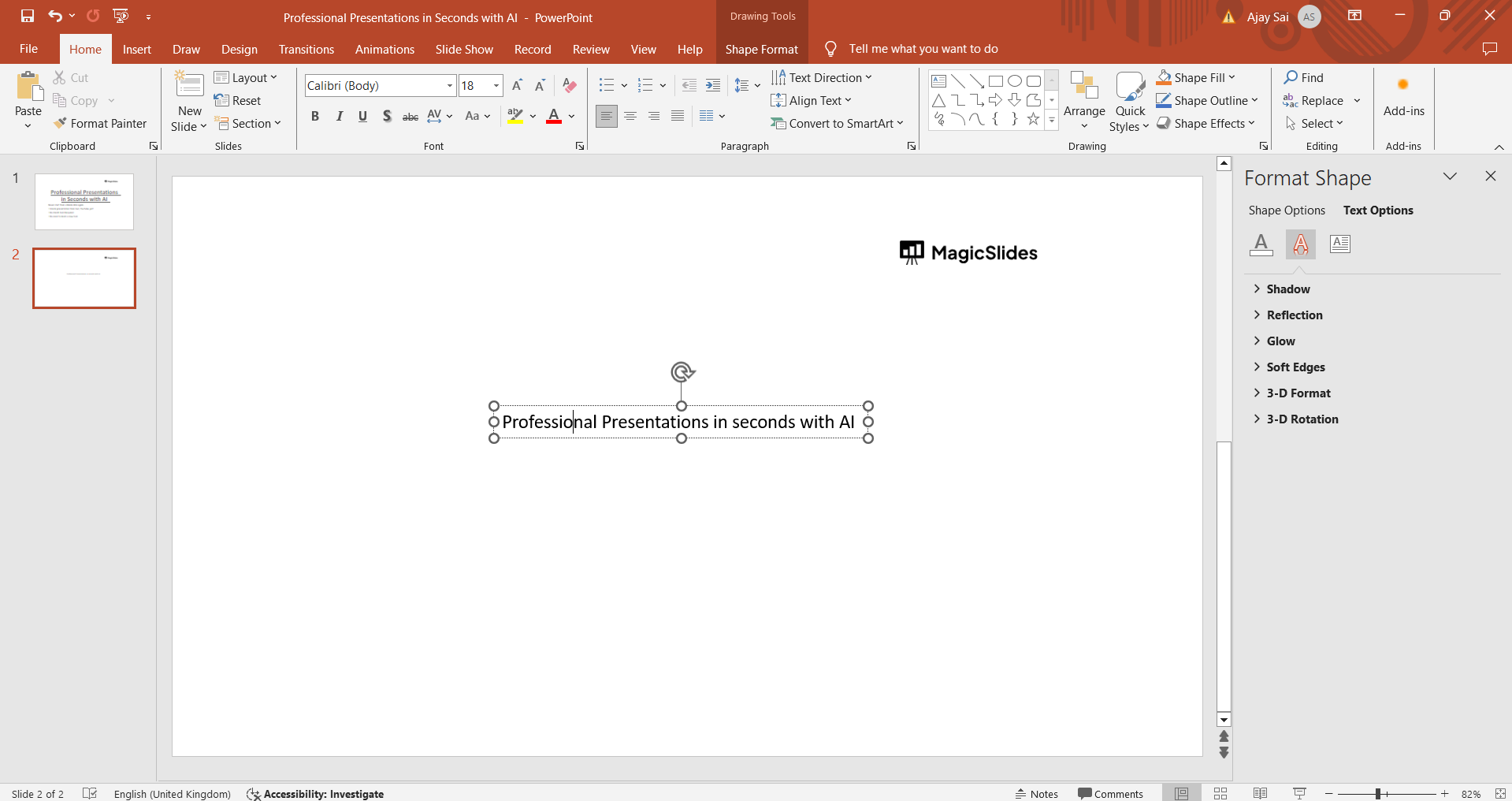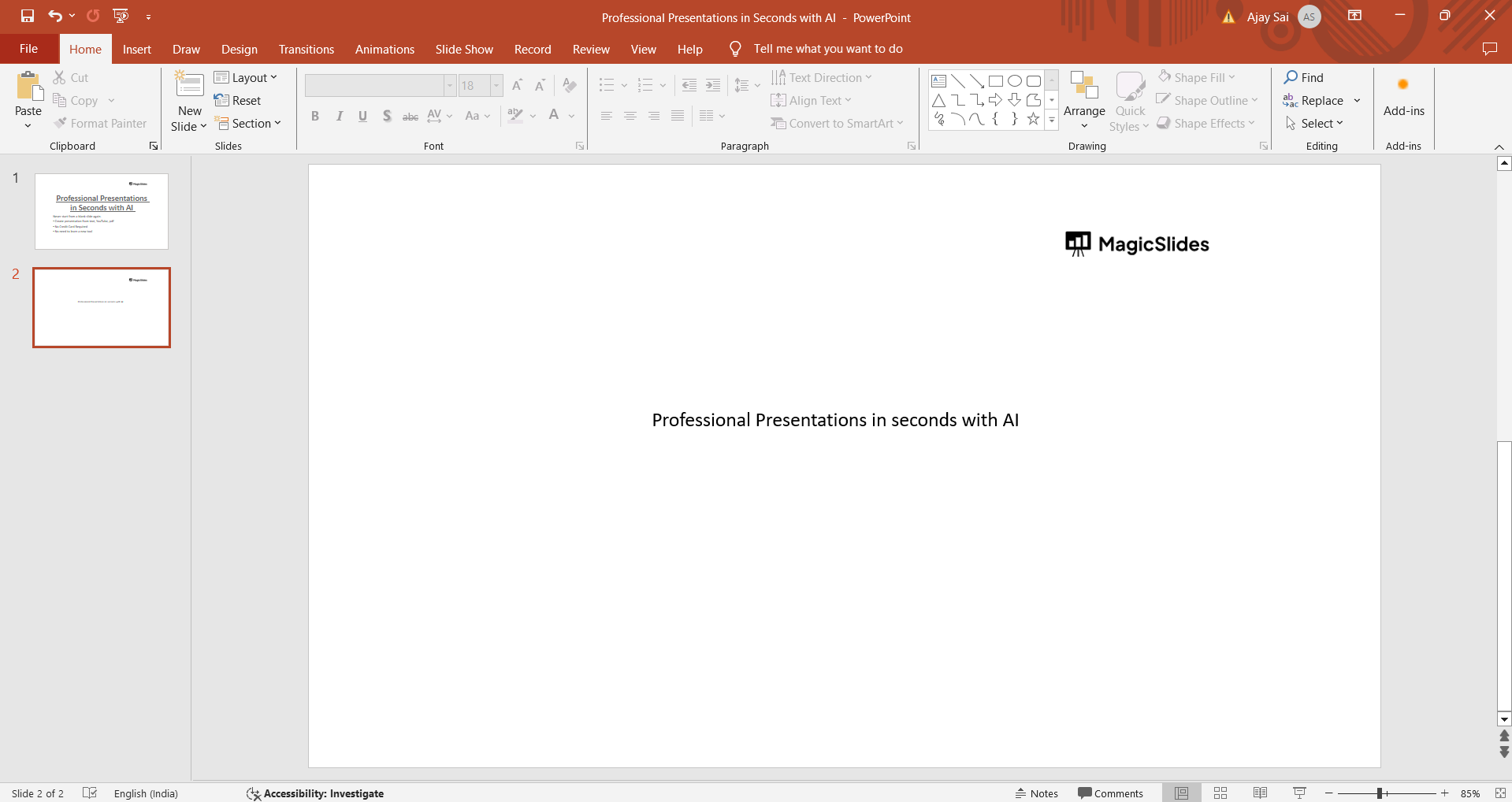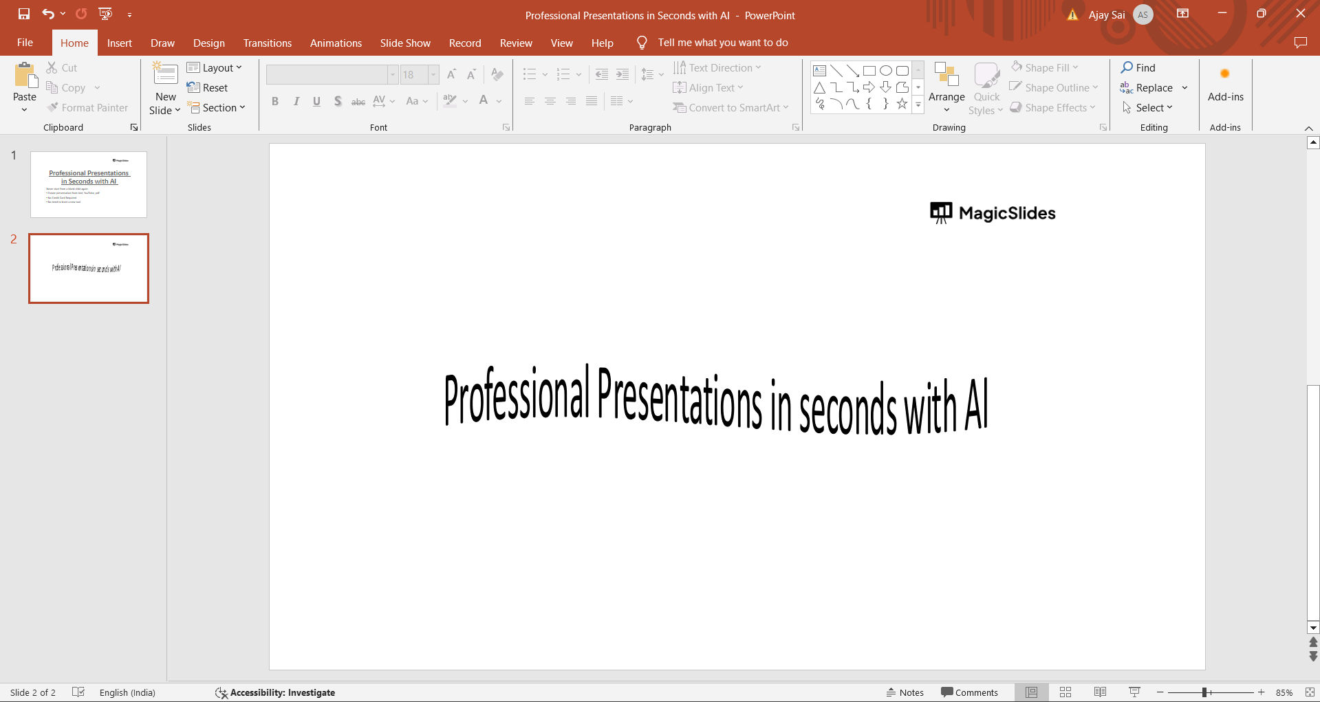Curving text manually in PowerPoint using WordArt is simple. But there are times when users need to do so with multiple slides simultaneously. For the same reason, a manual solution is not practical; that’s why I’m suggesting an automated utility, i.e., MagicSlides AI PPT Creator, to generate structured slides quickly.