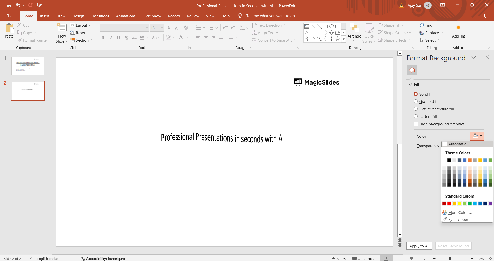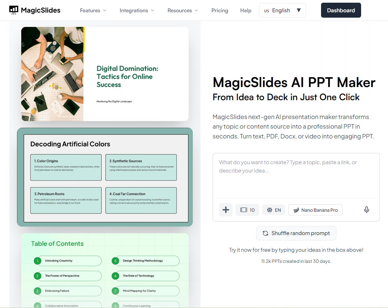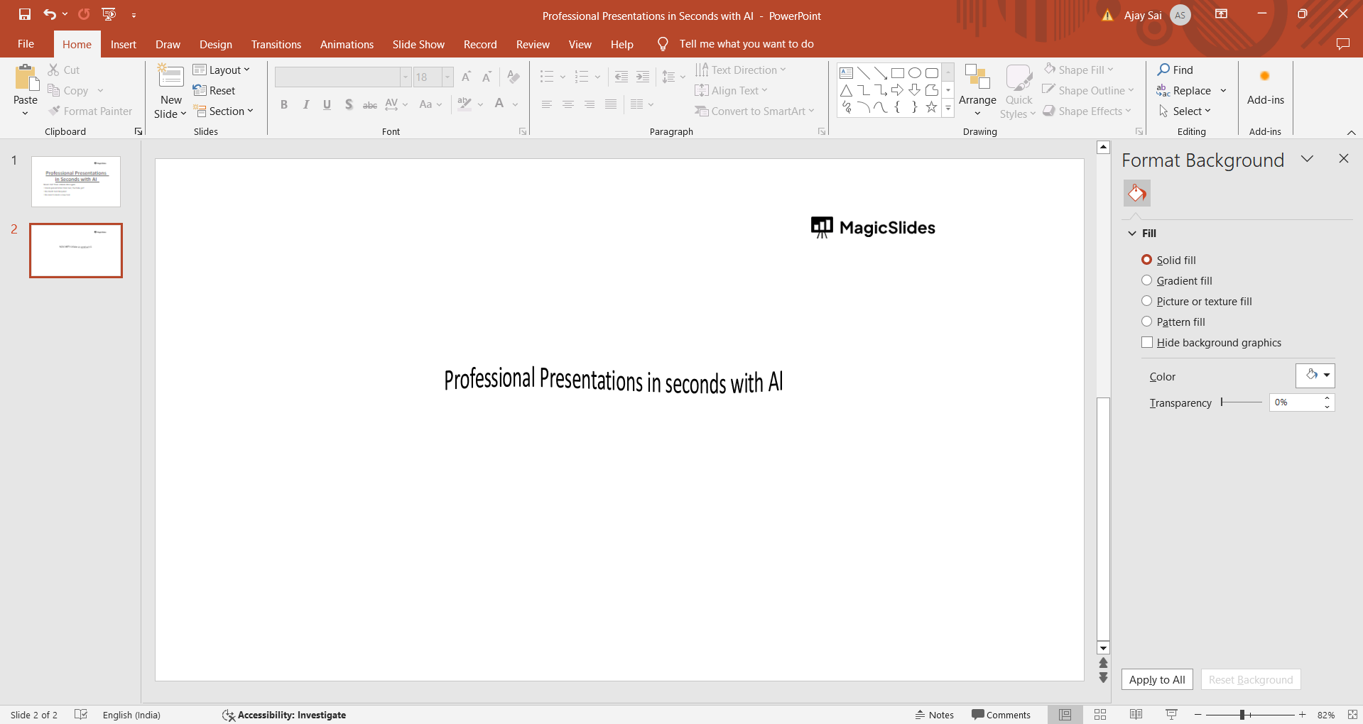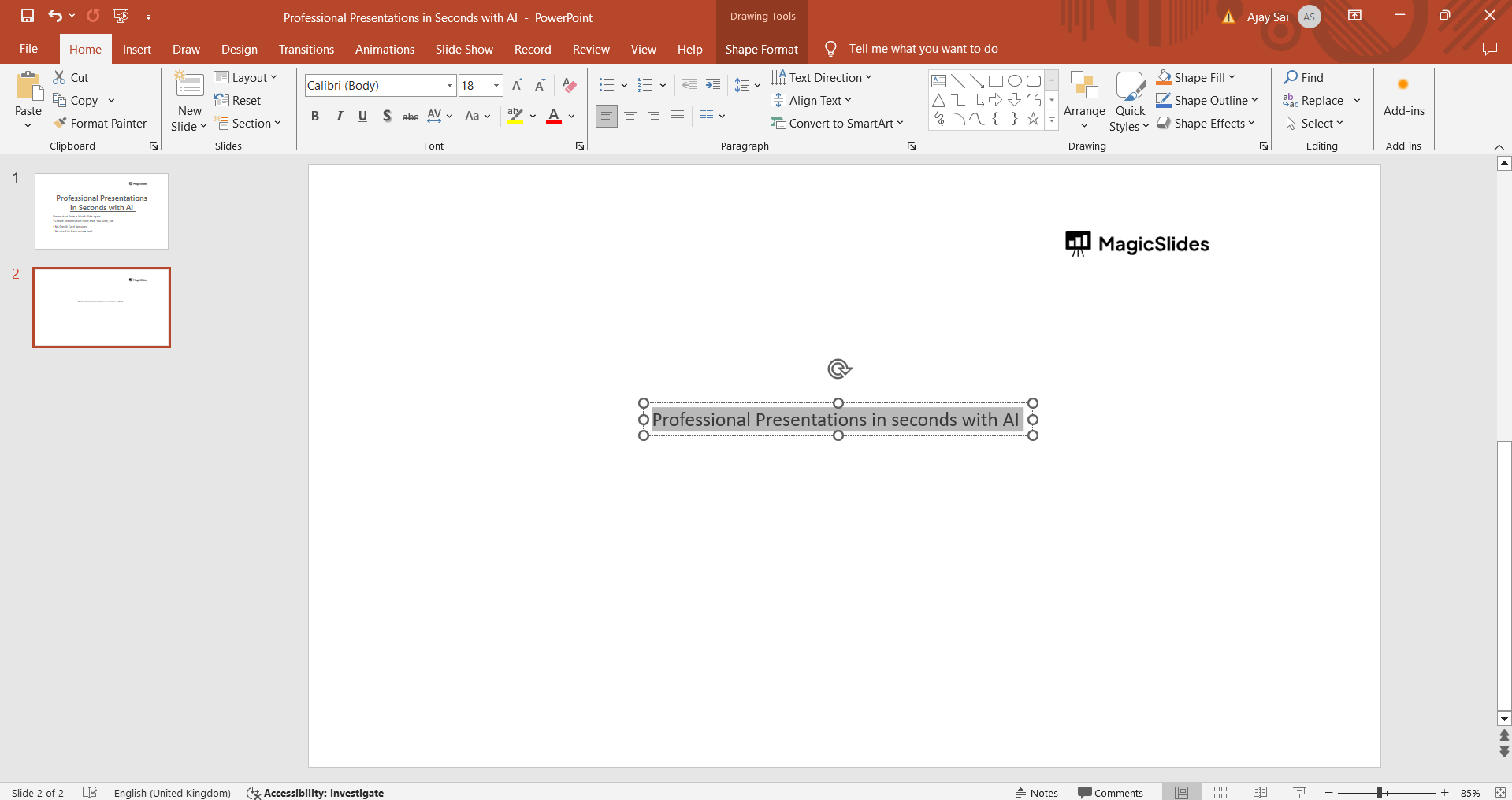 Curving text manually in PowerPoint using WordArt is simple. But there are times when users need to do so with multiple slides simultaneously. For the same reason, a manual solution is not practical; that’s why I’m suggesting an automated utility, i.e., MagicSlides AI PPT Creator, to generate structured slides quickly.