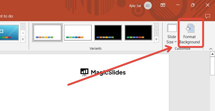 In the “Design” tab, locate the “Format Background” option, typically on the far-right side of the ribbon.
