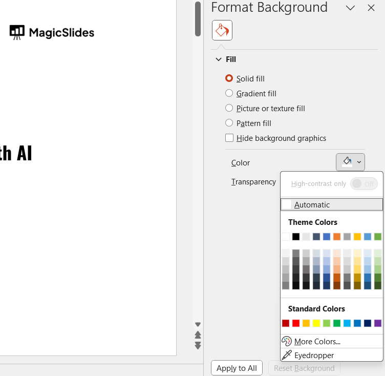 If you want the new background for all slides, click the “Apply to All” button at the bottom of the "Format Background" panel. If not, the changes will only affect the slide you’re working on.