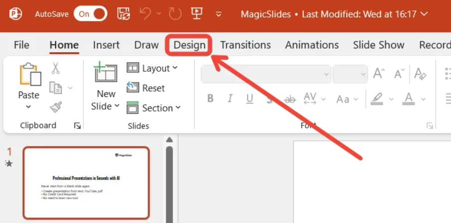 Next, navigate to the "Design" tab located on the PowerPoint ribbon at the top of the screen.