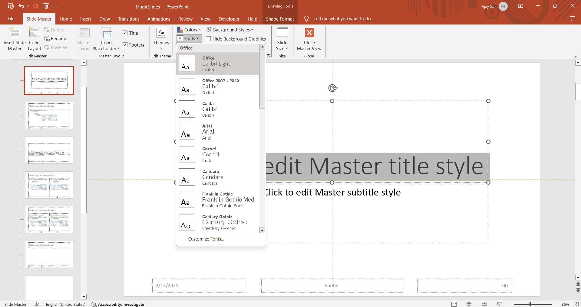 Click on the title text box of the Master Slide. Go to the Home tab and click on the Font dropdown menu.