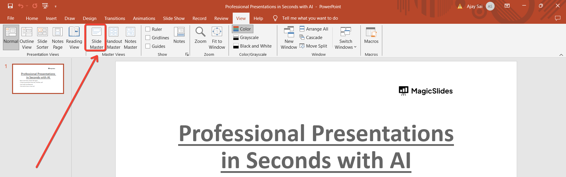 Navigate to the "View" tab on the PowerPoint ribbon. In the "Master Views" group, click on "Slide Master." This action will switch your view to the Slide Master view, where you can see and edit the master slide layouts.