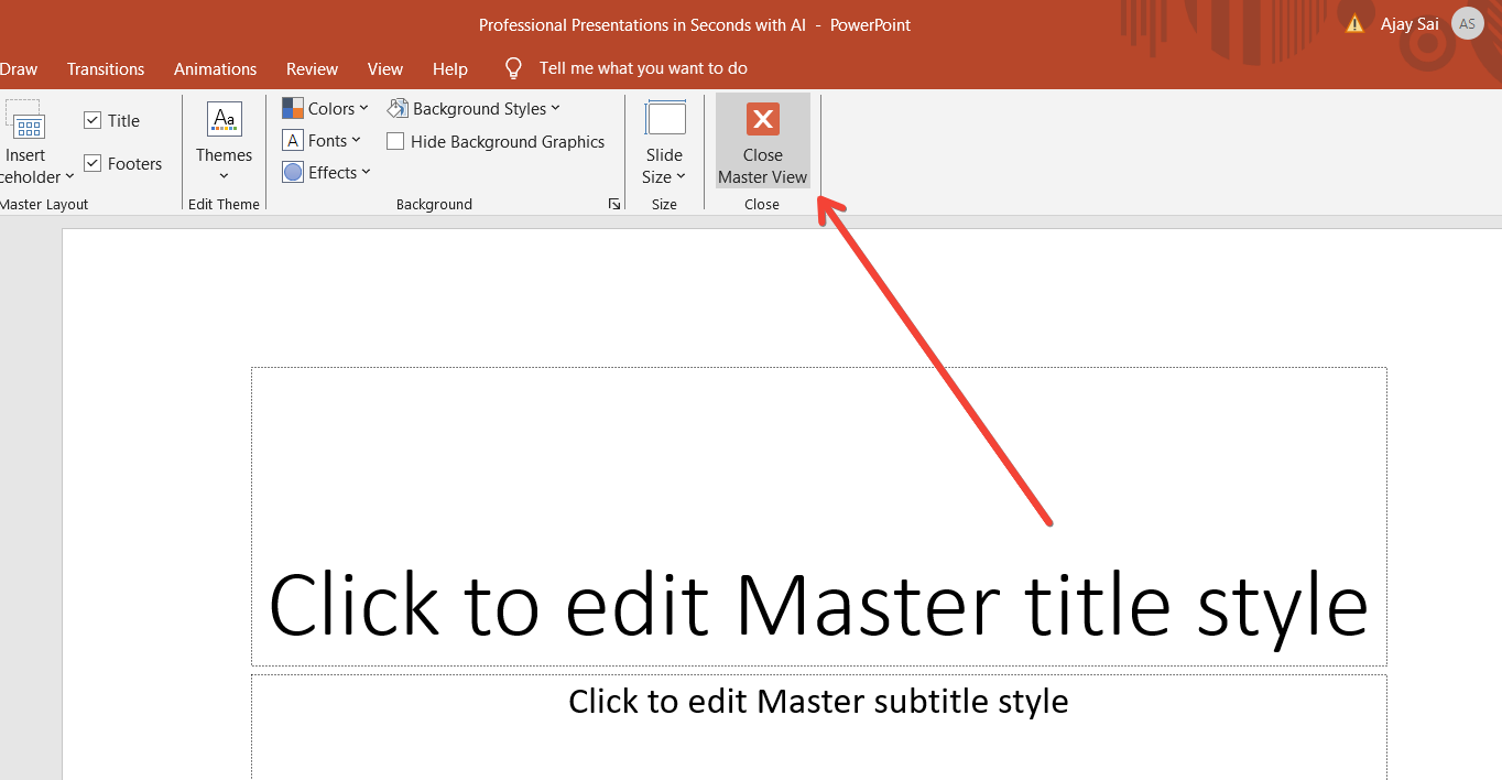 Once you've made the necessary changes to the master slide, exit the Slide Master view. To do this, simply click on the "Close Master View" button in the Slide Master tab or click on the "Normal" button in the status bar at the bottom of the window.