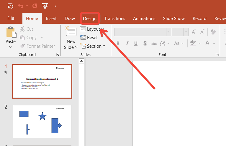 Once your presentation is open, go to the "Design" tab in the top toolbar.