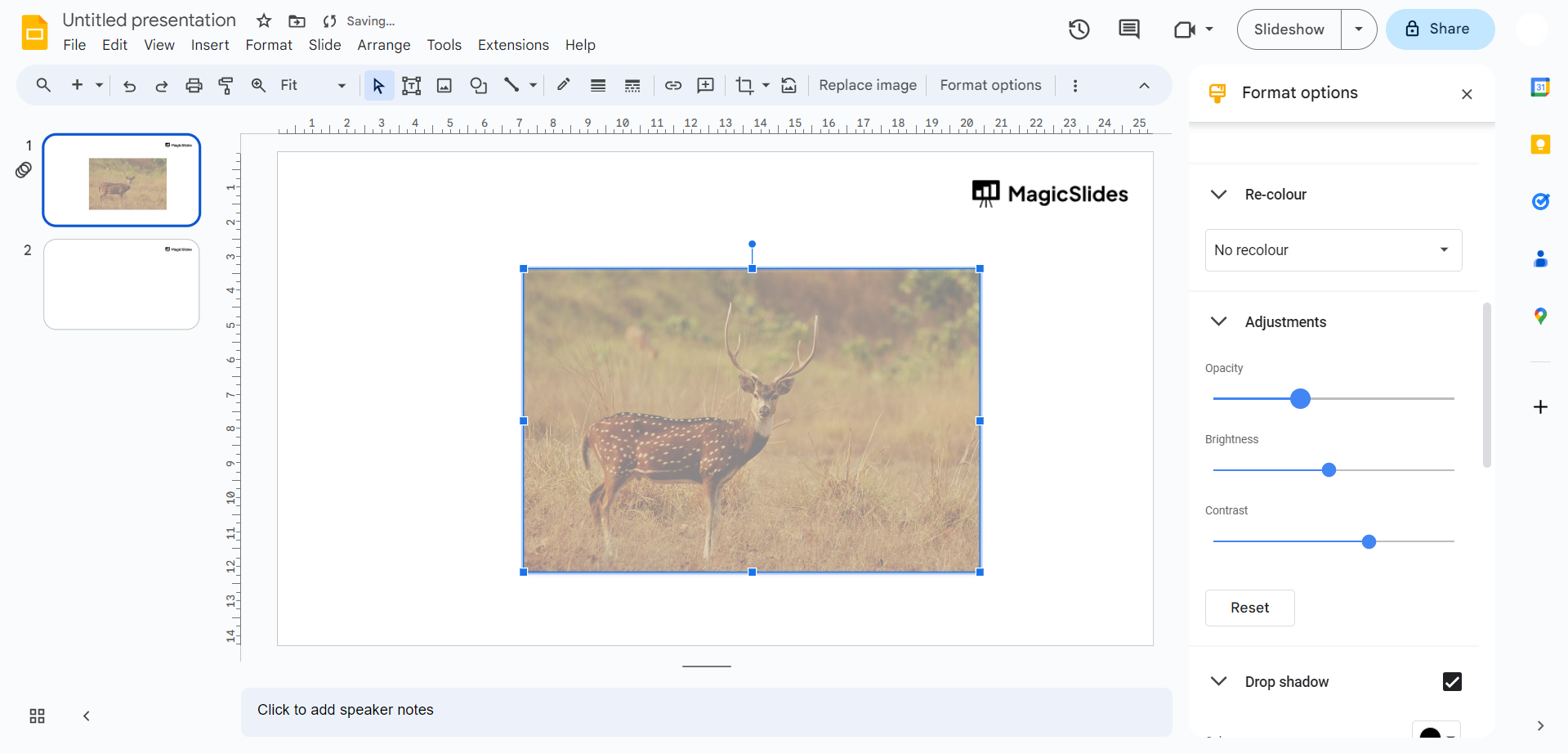 → Adjust Transparency: In the "Format" dropdown menu, hover your cursor over "Transparency." A submenu will appear with a slider. You can slide the transparency bar to the left (towards 0%) to make the object more transparent or to the right (towards 100%) to make it less transparent. You can additionally change the levels of opacity, brightness etc if transparent option is not available in the newer versions.