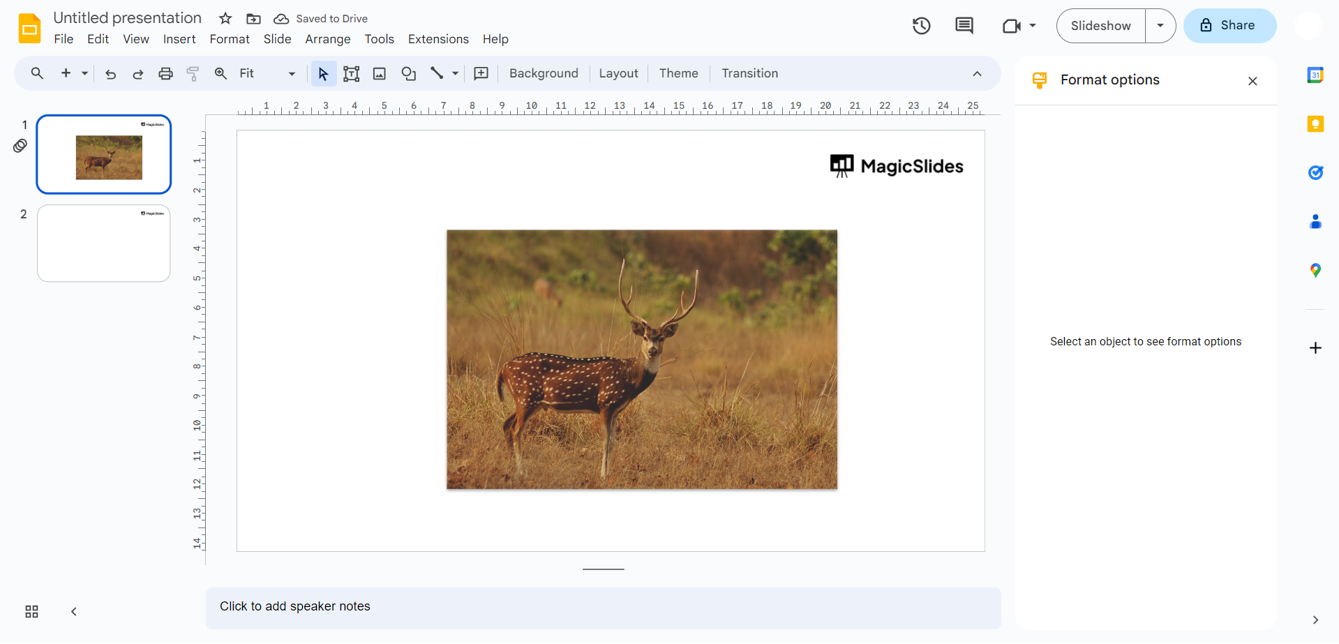→ Access the "Format" Menu: In the toolbar at the top of the Google Slides window, click on the "Format" tab. This will open a dropdown menu.
