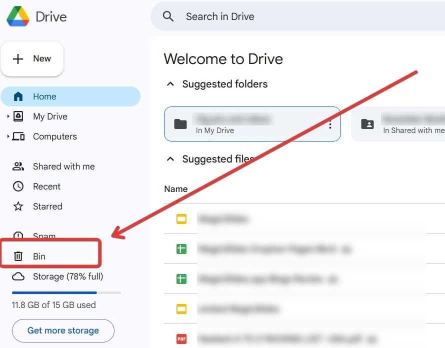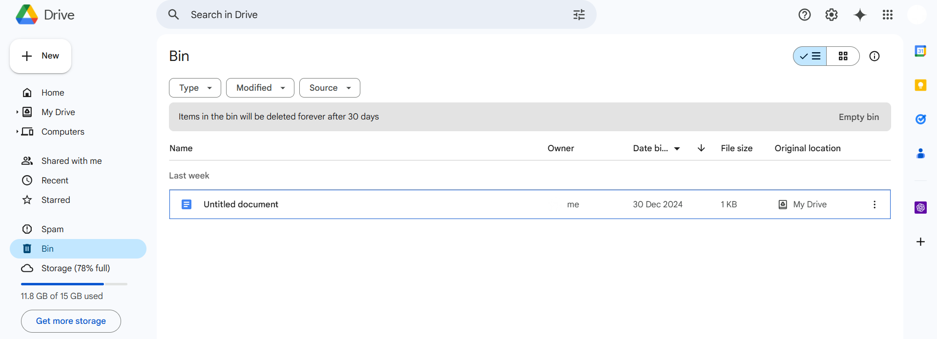 Once confirmed, right-click on the file and select “Restore” to move it back to its original location in Google Drive.