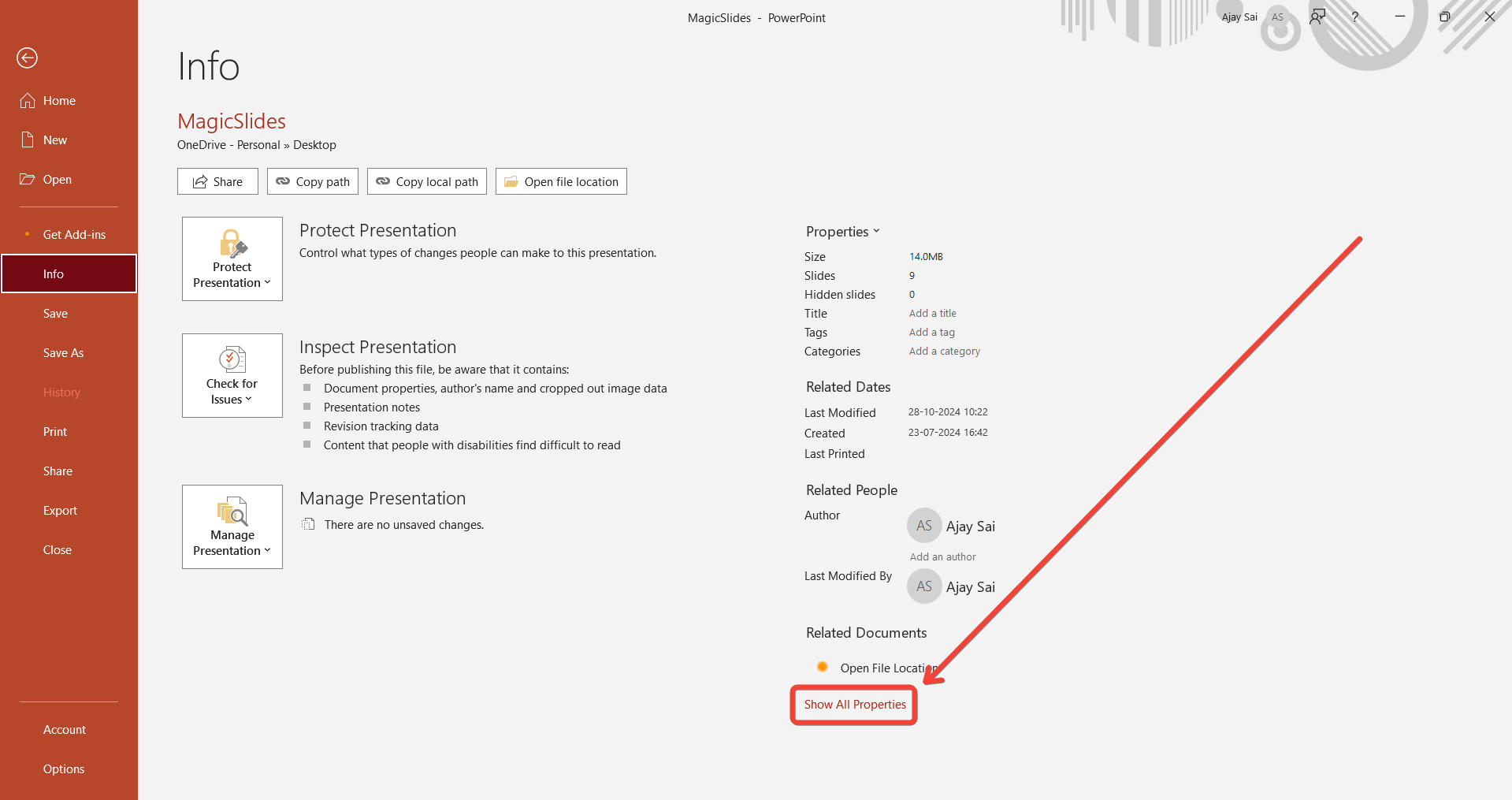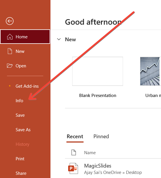Within the “File” tab, click on “Info” to view details about your presentation.