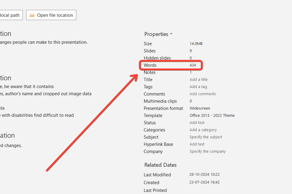 Here, you’ll find several options and statistics about your PowerPoint file.