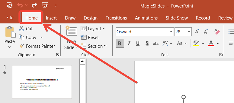After selecting the text, go to the "Home" tab located at the top of the PowerPoint window.