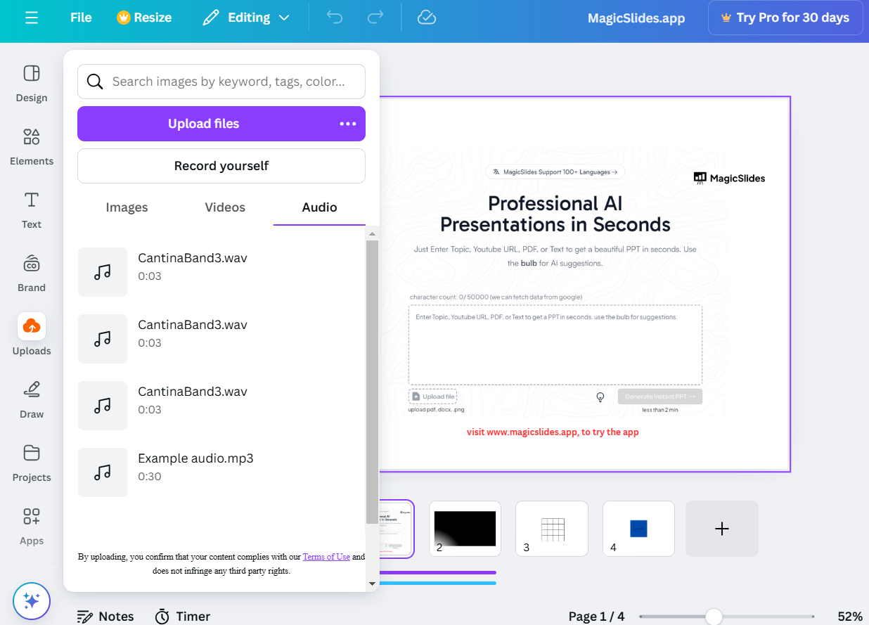 Canva supports popular formats like MP3, WAV, and M4A, but it’s best to use widely accepted formats like MP3.