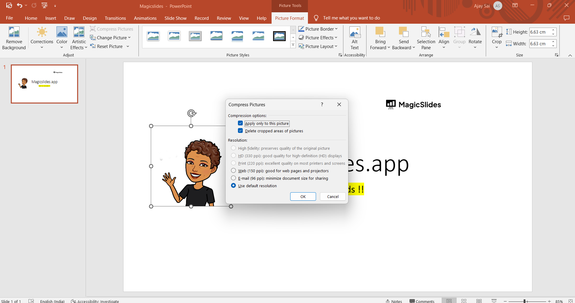 - Apply to: This option lets you decide whether you want to compress all the pictures in the presentation or just the one you selected.