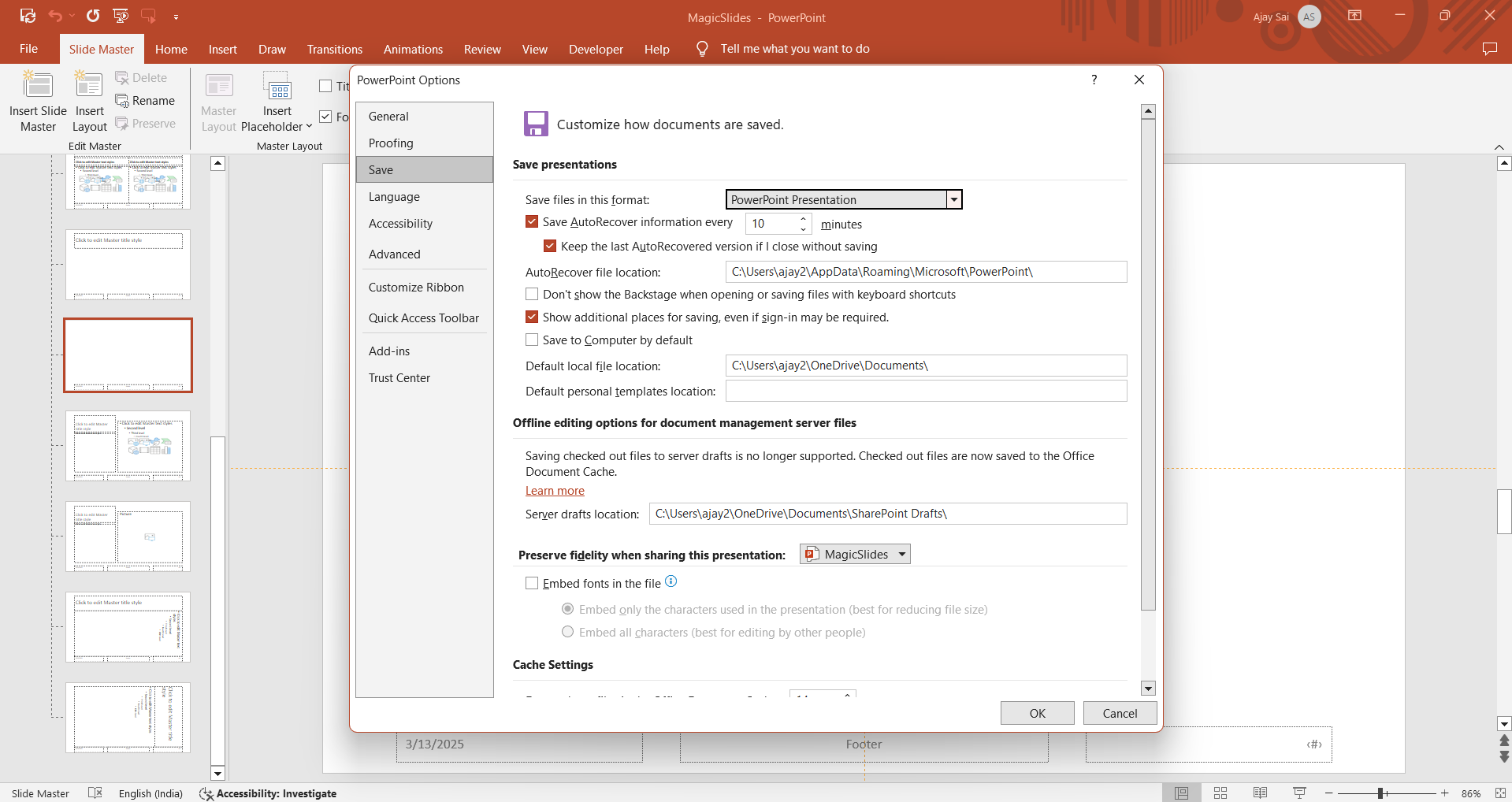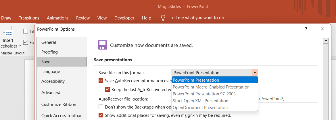 Click "File" > "Options." Go to "Save" on the left panel. Under "Preserve fidelity when sharing this presentation," uncheck "Embed fonts in the file."