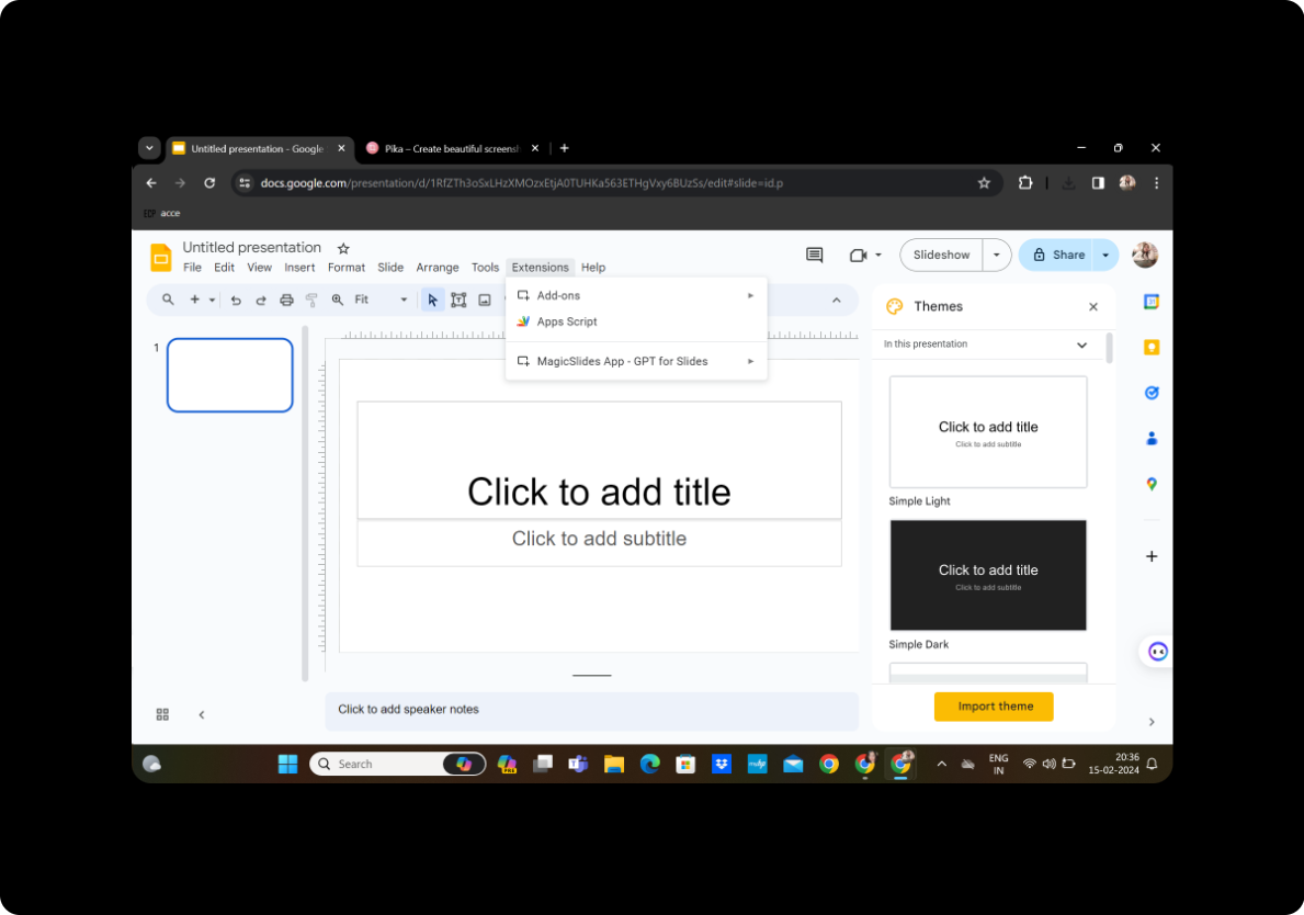 In the toolbar, find the "Extensions" tab and select "MagicSlides GPT" to activate the powerful tool.