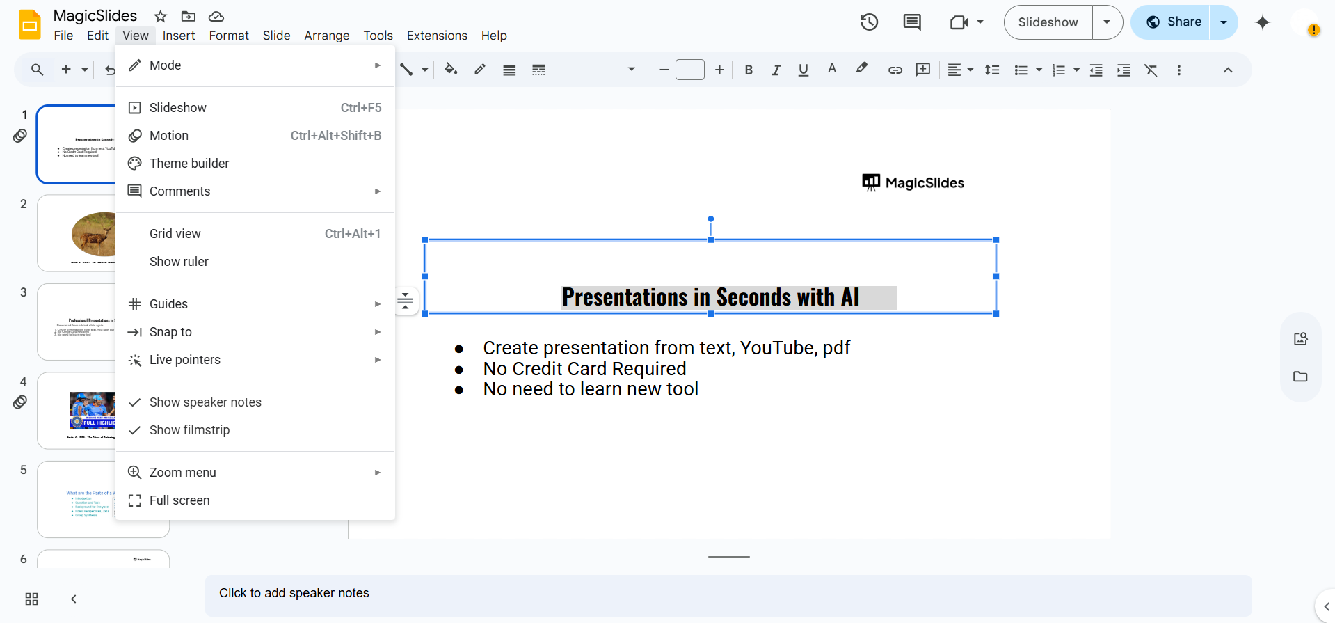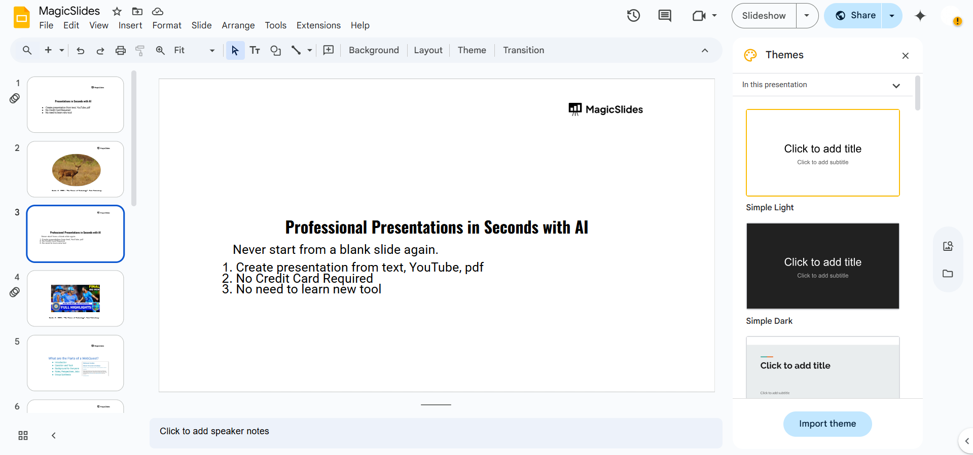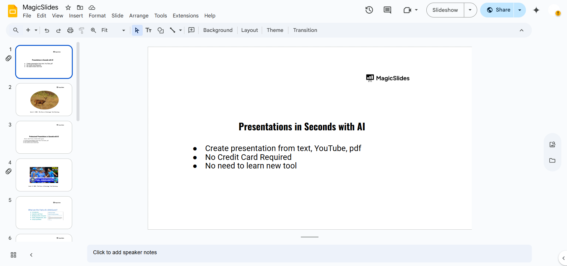 Whether it’s for work, school, or a pitch deck, building a presentation from scratch can take hours from researching and organizing content to designing each slide. But what if you could skip all that and have your presentation ready in under a minute? That’s exactly what MagicSlides does for you.