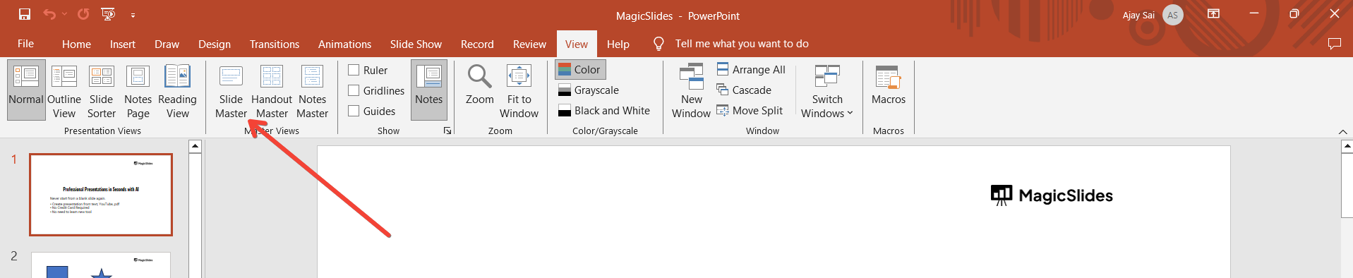 Click on the "View" tab in the ribbon at the top of the screen, then select "Slide Master."