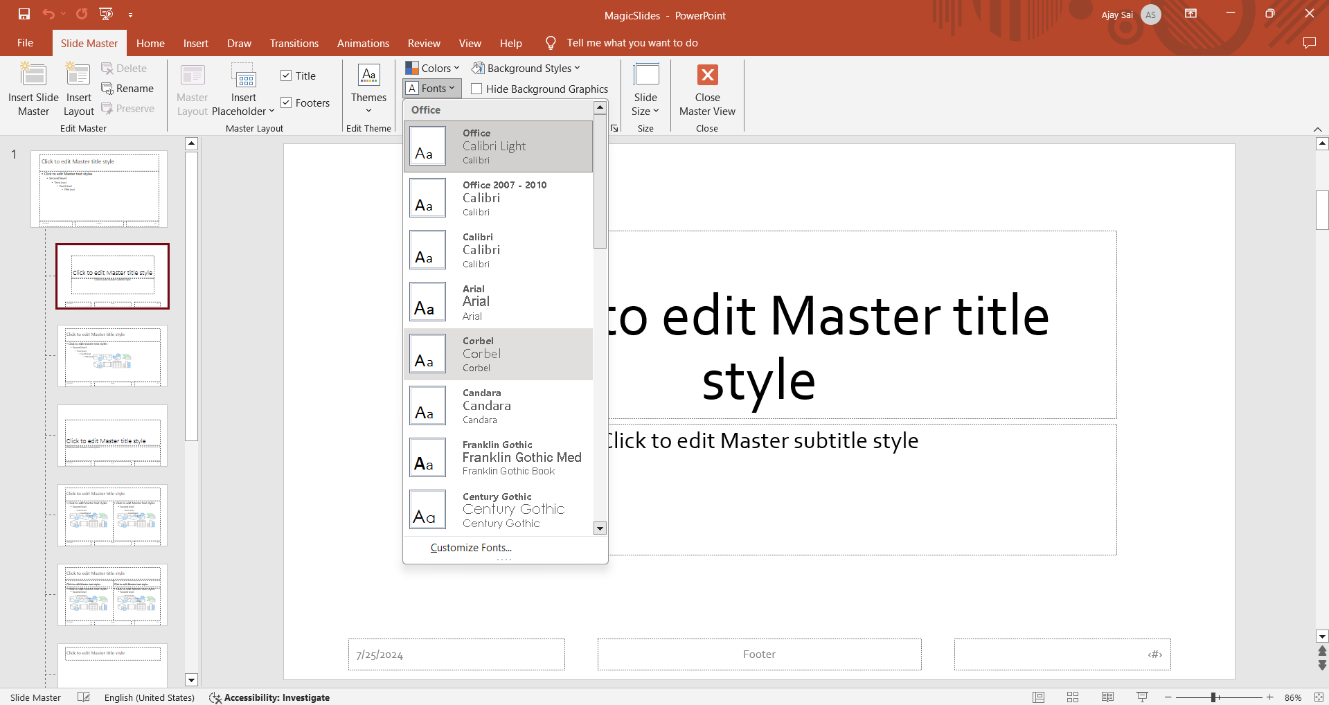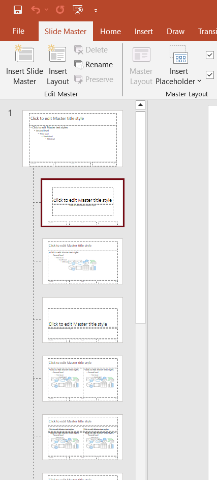 In the Slide Master view, you’ll see a list of slide layouts on the left pane. Select the layout where you want to add the placeholder.
