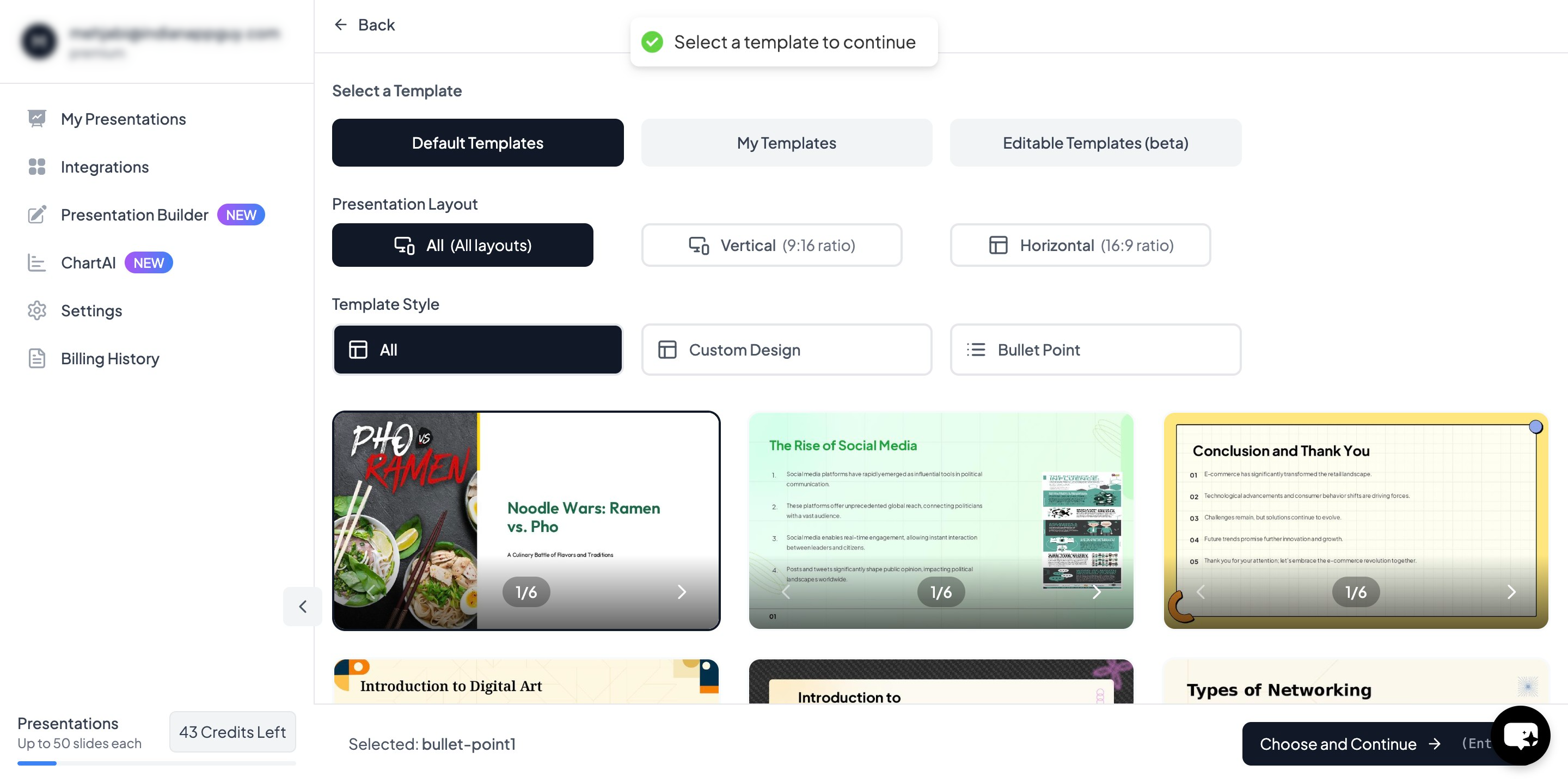 - Choose your template and select the number of slides as prompted.