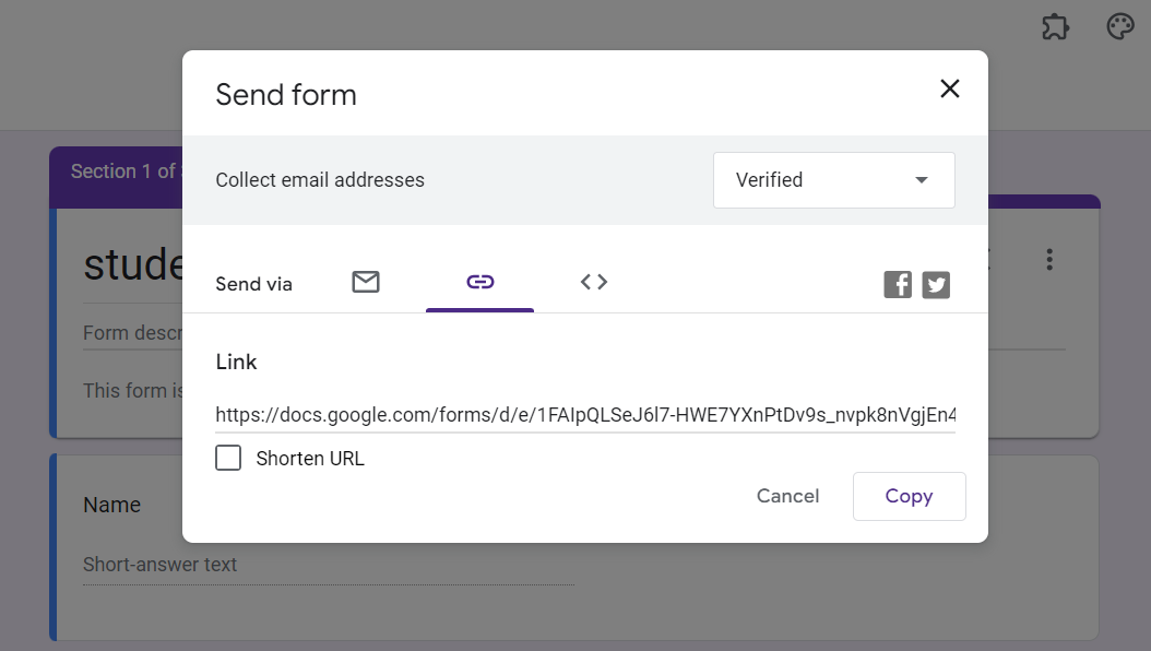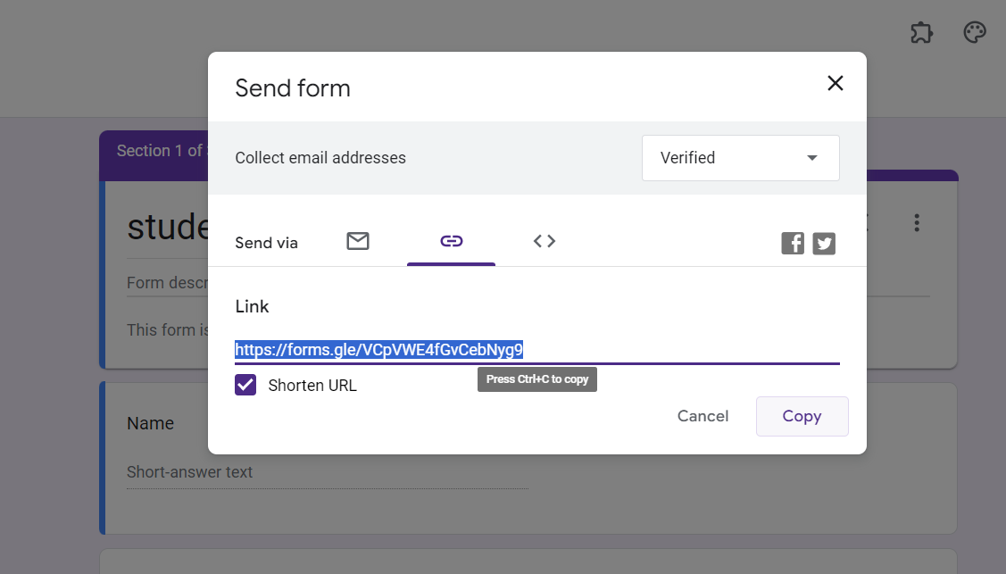 In the sharing options, select the link icon. This generates a shareable link to your Google Form.