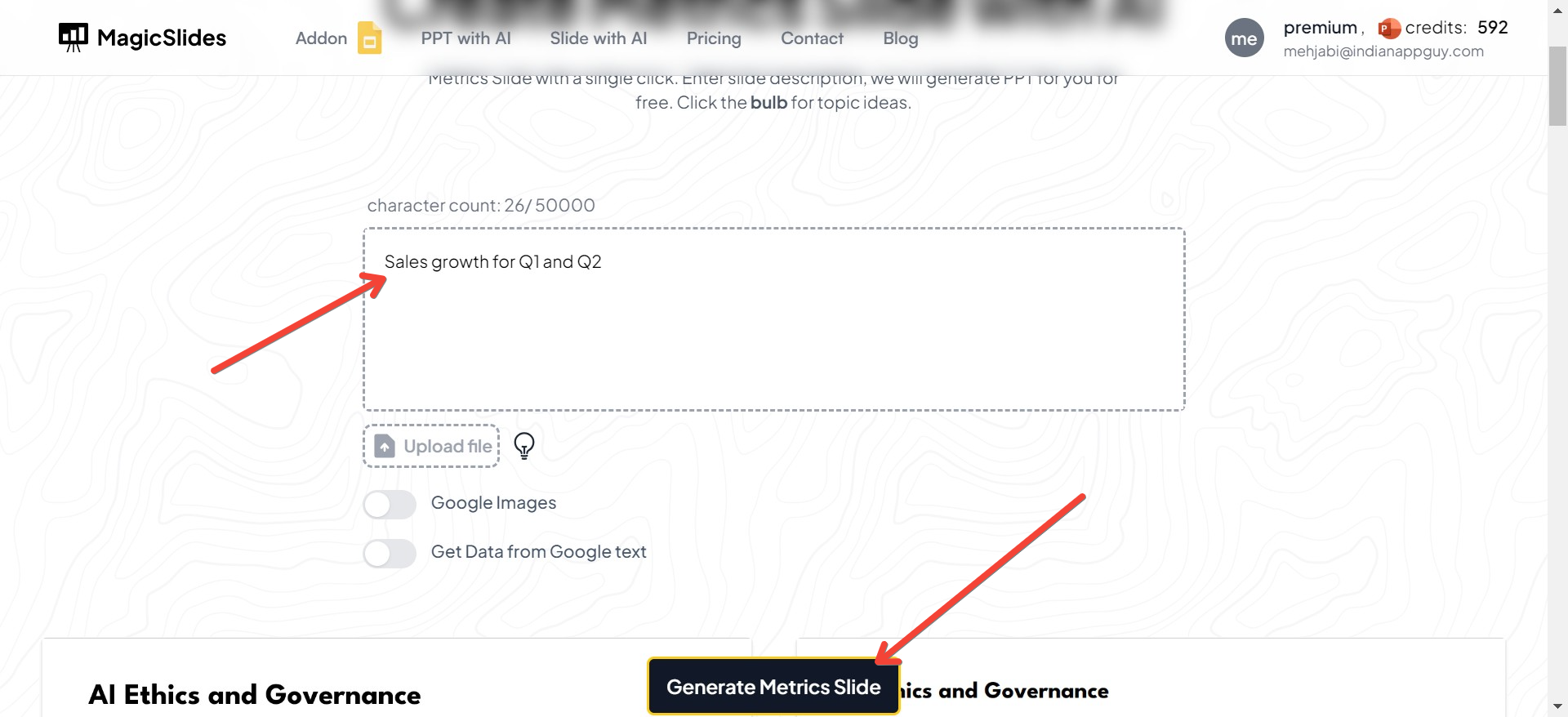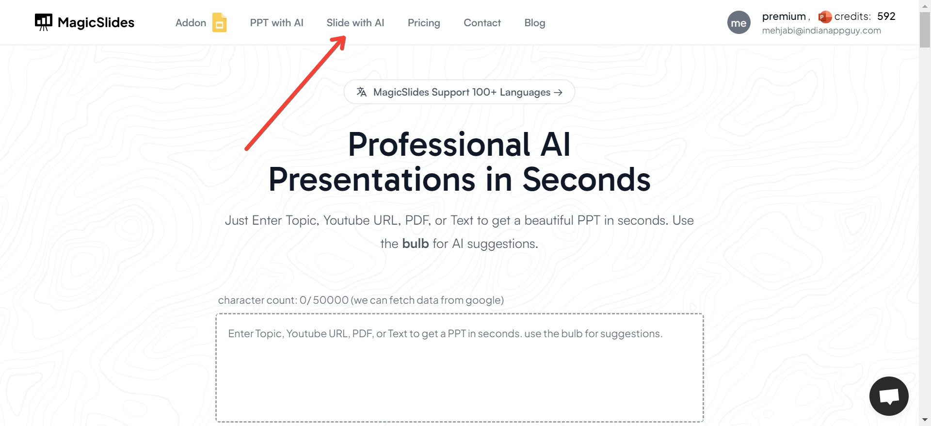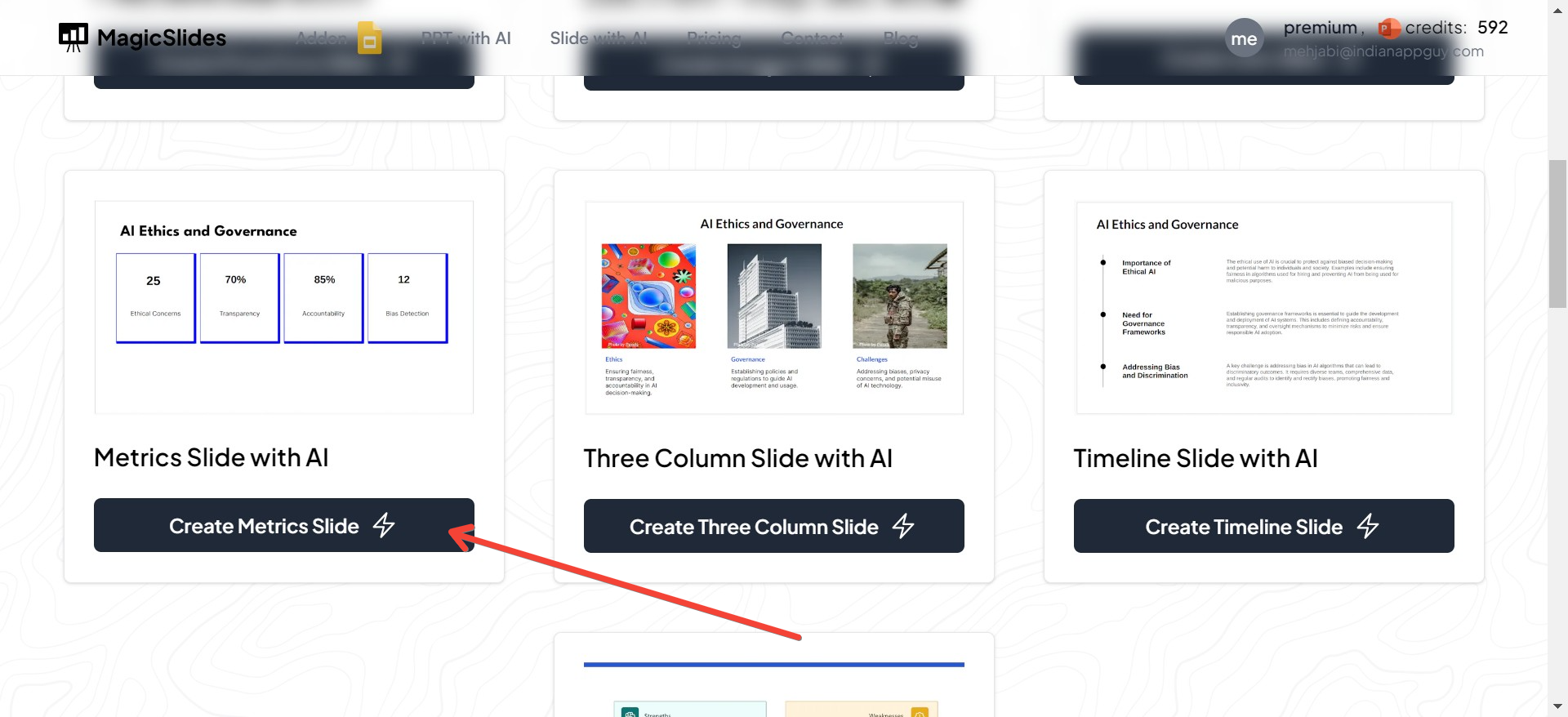 Once you're on the homepage, navigate to the "Slide with AI" option. This section is where all the AI magic happens! MagicSlides has multiple slide templates generated using AI, including business slides, content slides, and, of course, metrics slides.