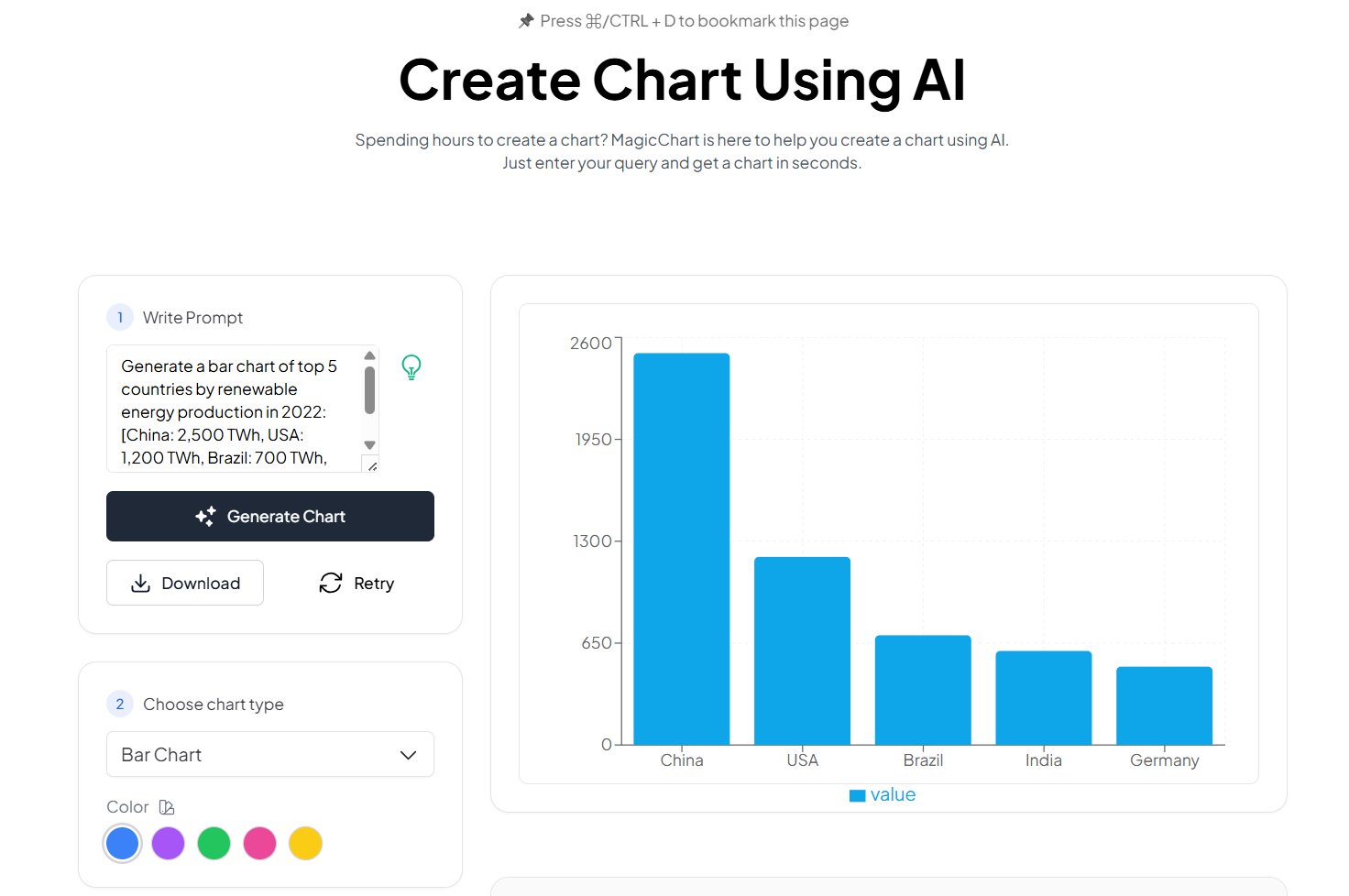 - In the “Write Prompt” box, enter your prompt (text) and scroll down to “Choose Chart Type”, i.e. Bar Chart, Area Chart, etc.
