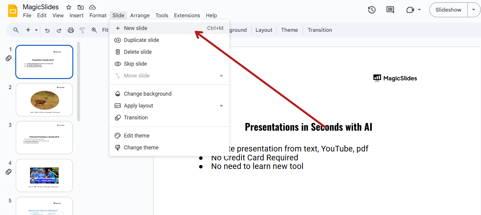 - Click on “+ New Slide” or press Ctrl + M (Cmd + M on Mac).