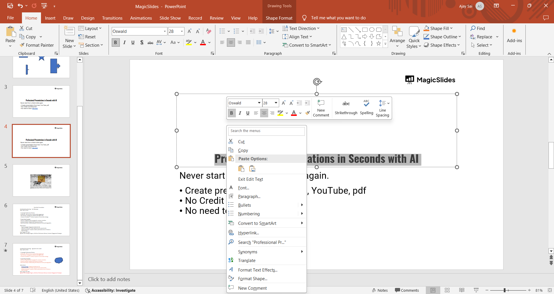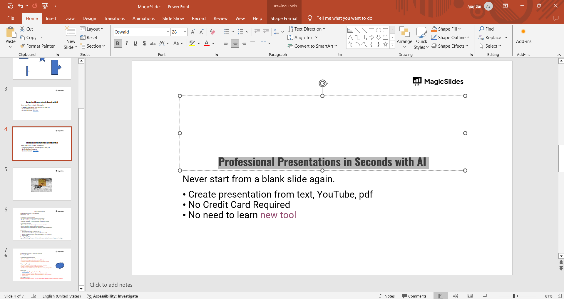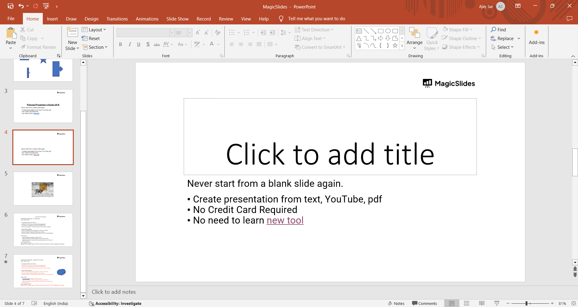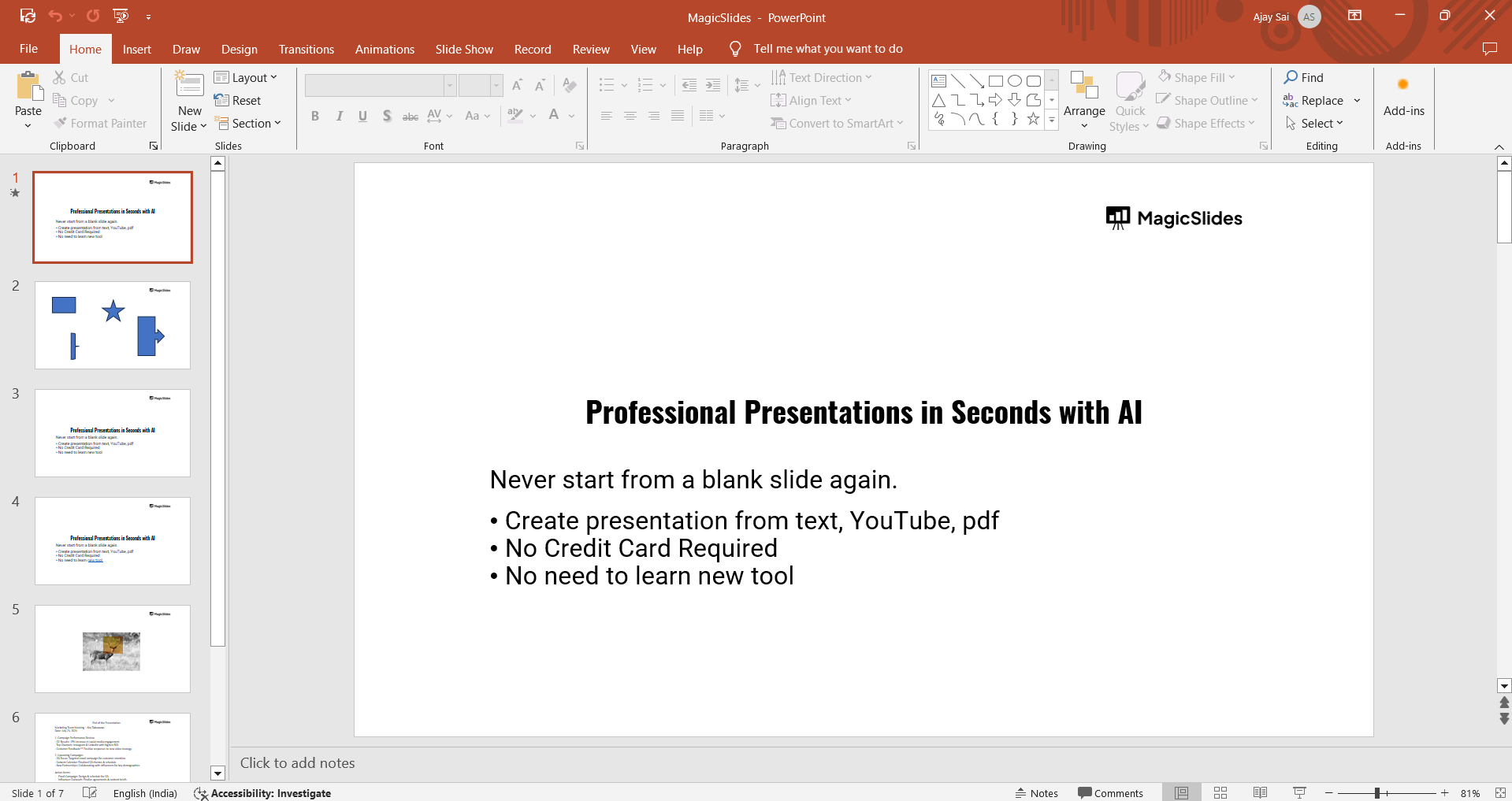 Tired of making presentations? what if we tell you you can make a presentation with just a prompt, convert YouTube videos to PPTs, convert website content to PPTs? Yes! checkout magicslides.app that does all and enjoy the free credits to make presentations in seconds.