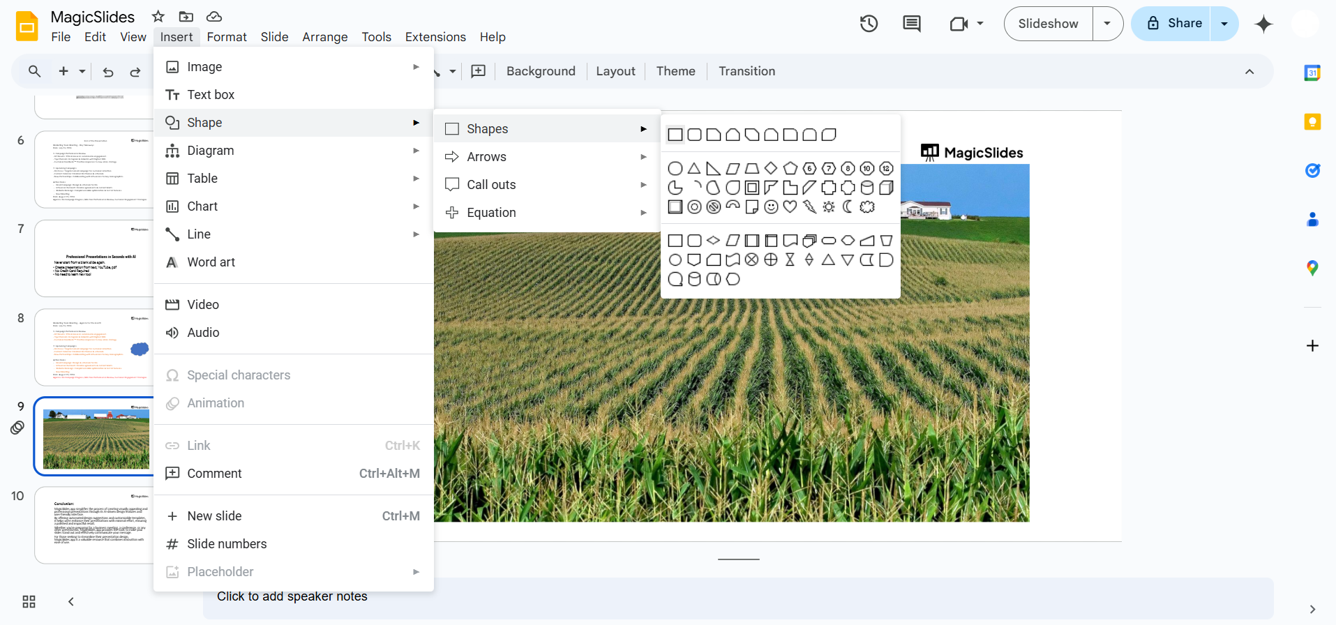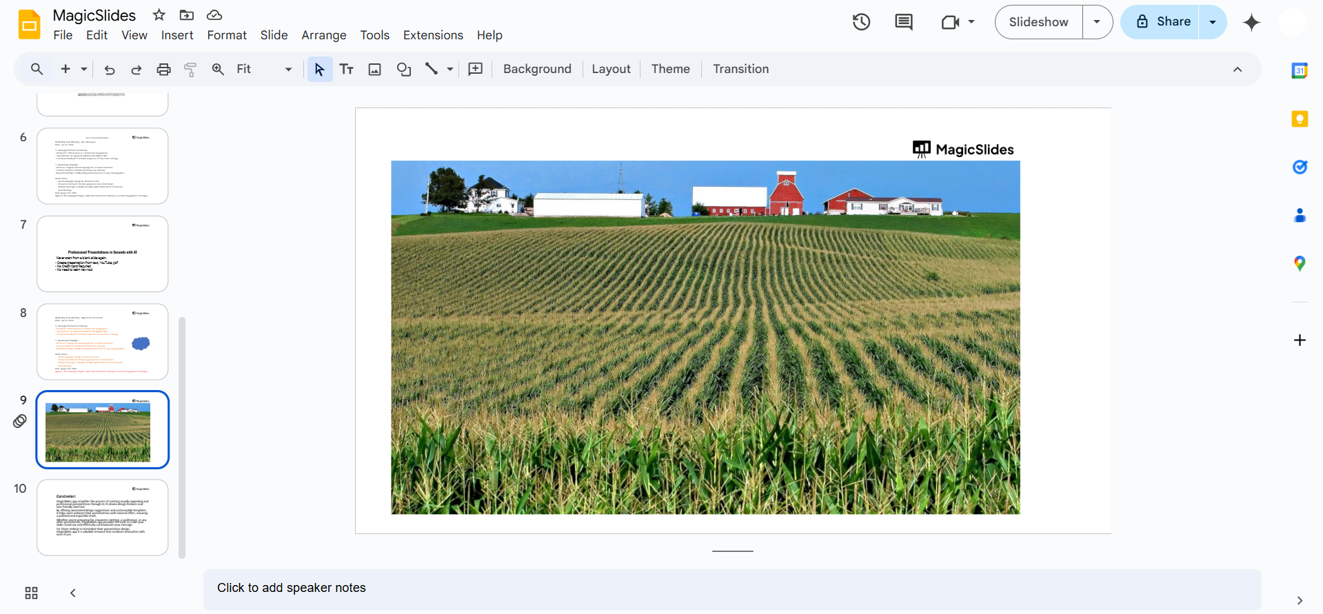 Right-click on the slide and select “Change Background.” Choose a green or brown color or upload an image of a cornfield.