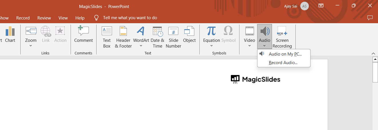 Click on the "Insert" tab in the top menu, then select "Audio" and choose "Audio on My PC."