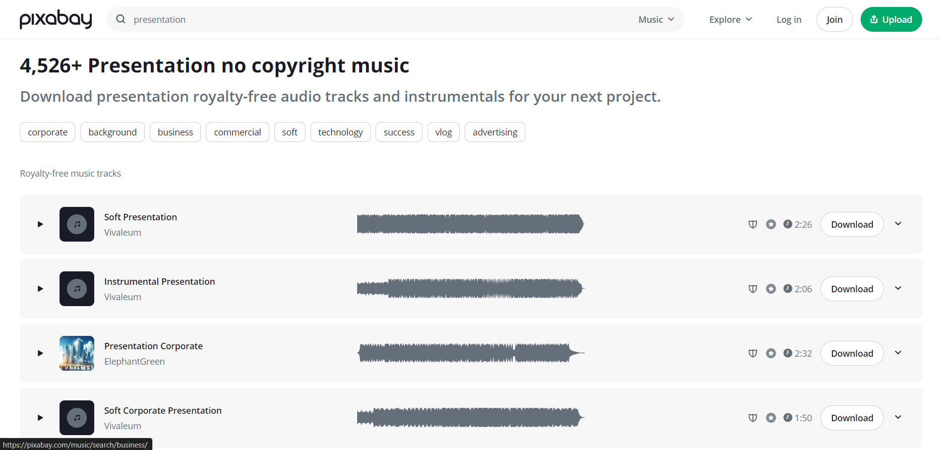 Use filters to sort by genre, mood, or length, depending on your presentation’s needs.