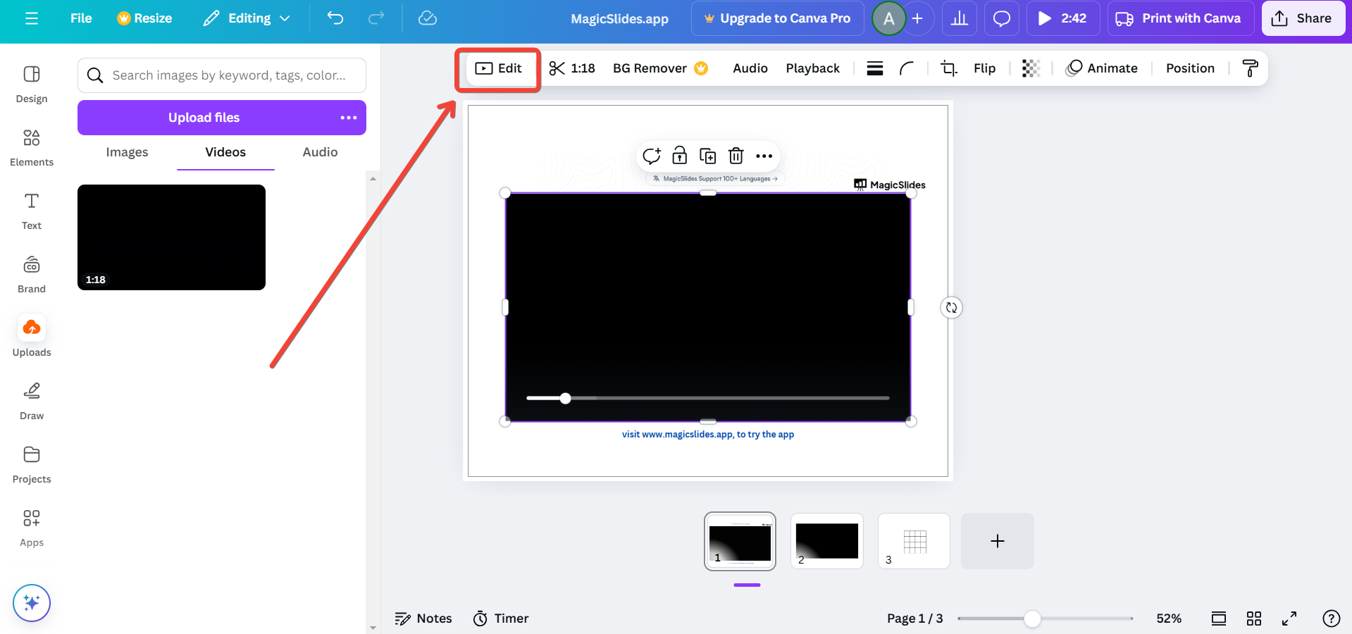 Ensure your design is set to a video format to enable timeline editing.