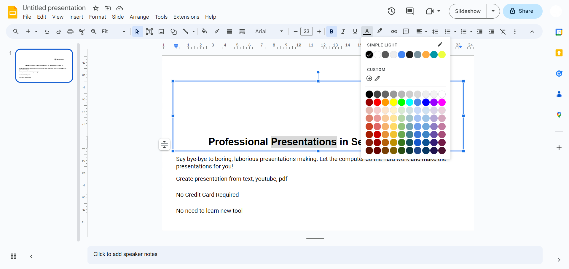 Following these detailed steps ensures that you can effectively highlight text with color in your Google Slides presentation, adding emphasis and visual appeal to your content. Keep in mind that this method changes the text color itself; it doesn't add a background color or a traditional highlighting effect. If you want to add a background color, you can use the "Background color" option in the toolbar, but note that this will apply to the entire text box, not just the selected text.