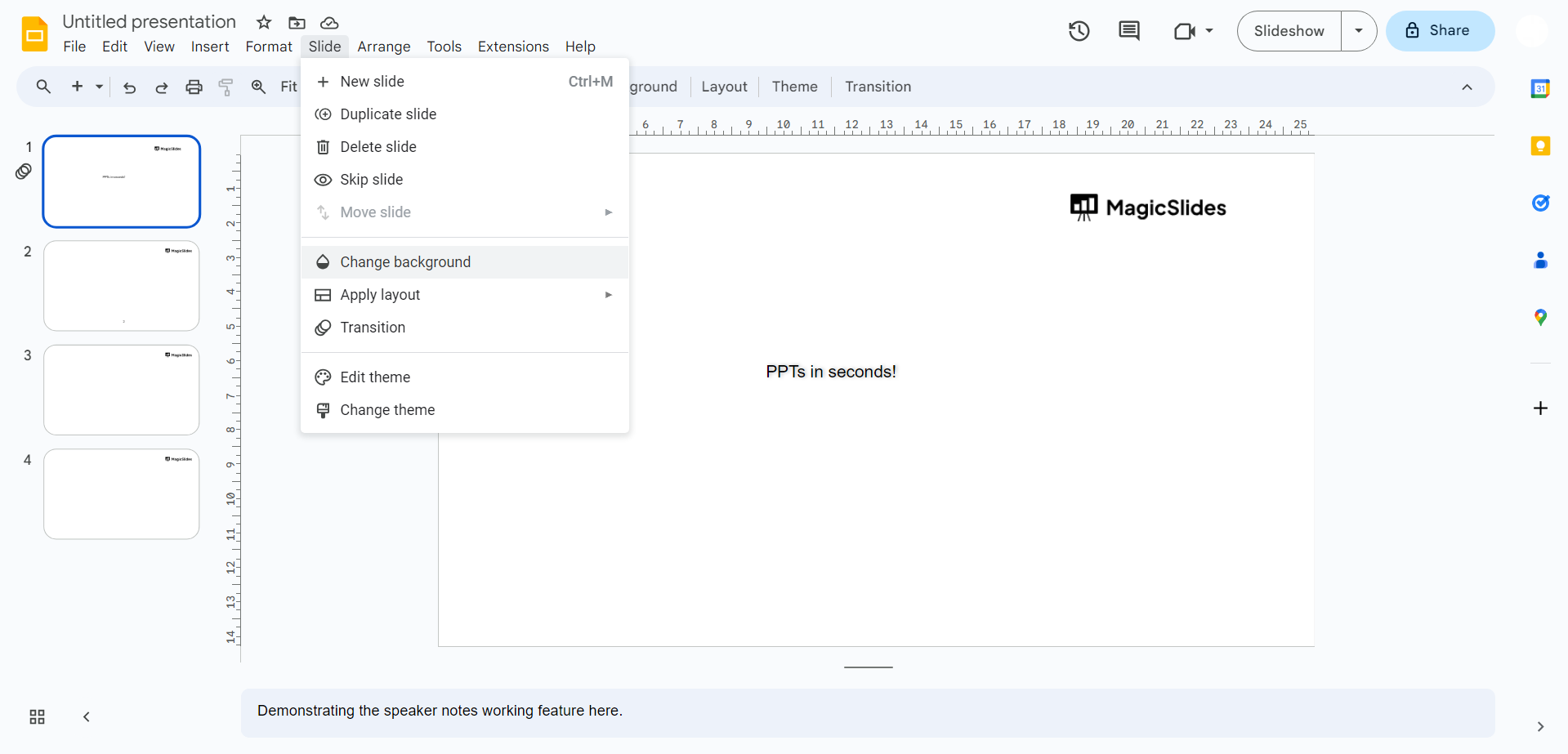 → Go to Slide > Change Background: Click on "Slide" in the top menu, then select "Change background" from the dropdown.