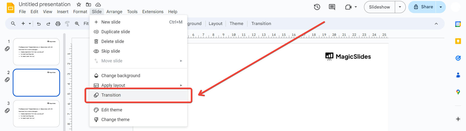 From the drop-down menu, select "Transition." This option will allow you to set the duration for each slide, effectively creating a timer for your presentation.