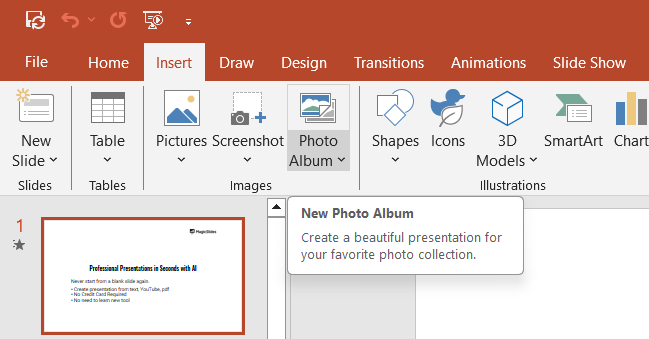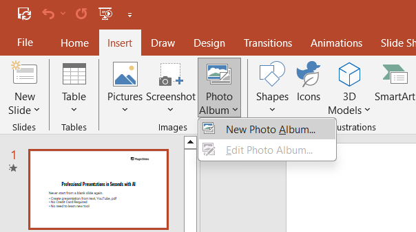In the Insert tab, locate and click on the “Photo Album” dropdown menu.