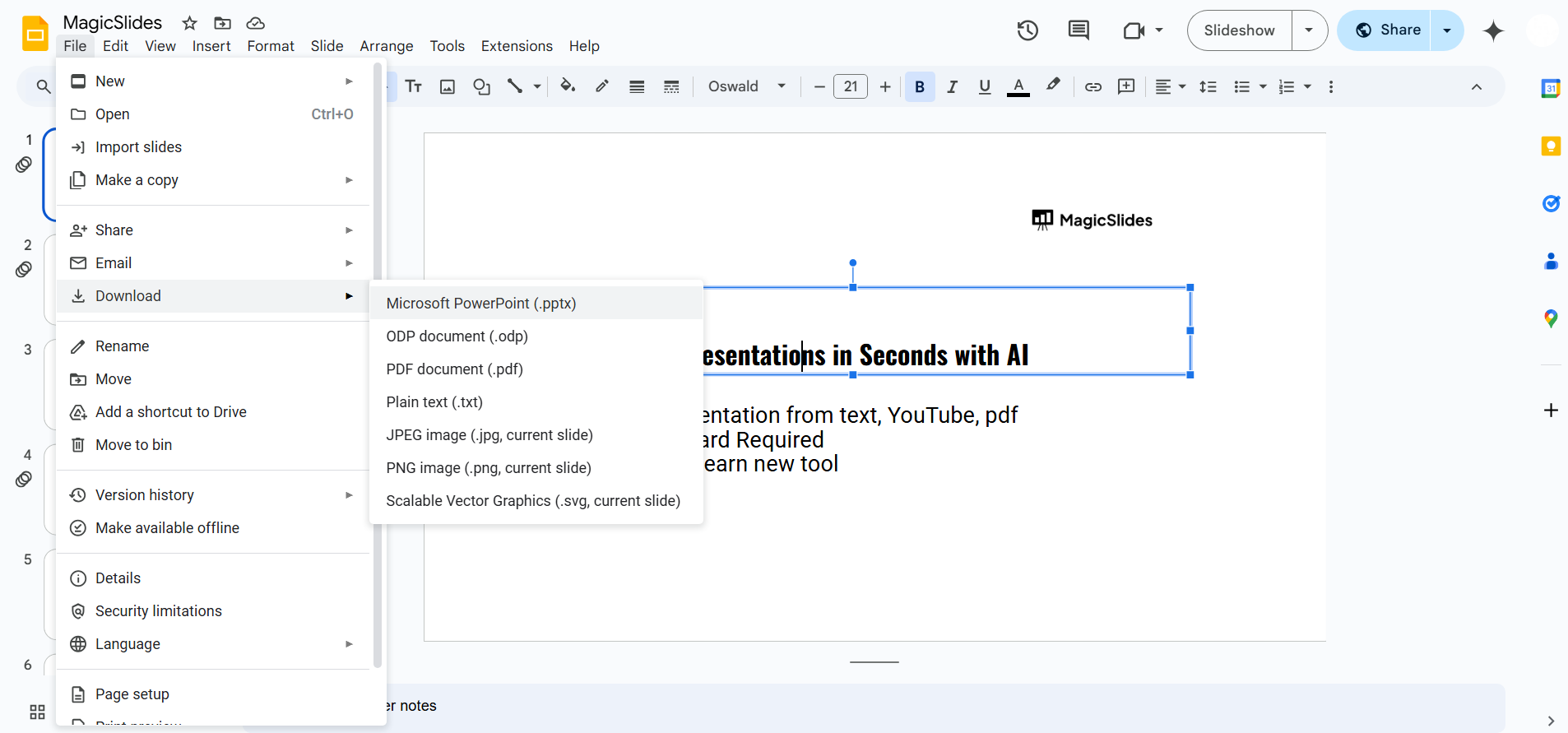 - Go to File > Download > PNG image (.png) or JPEG image (.jpg) to save the slide as an image.