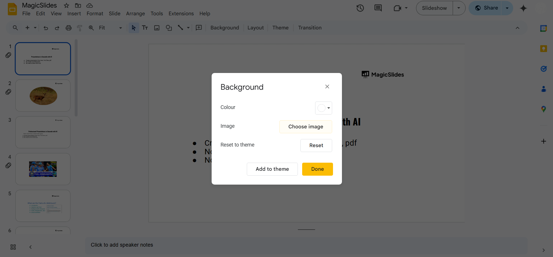 - Click on Background > Choose Image > Upload the downloaded image to set it as the slide background.