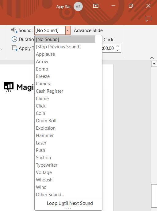 Select a transition, and click "Apply To All" if you want a uniform effect across slides.