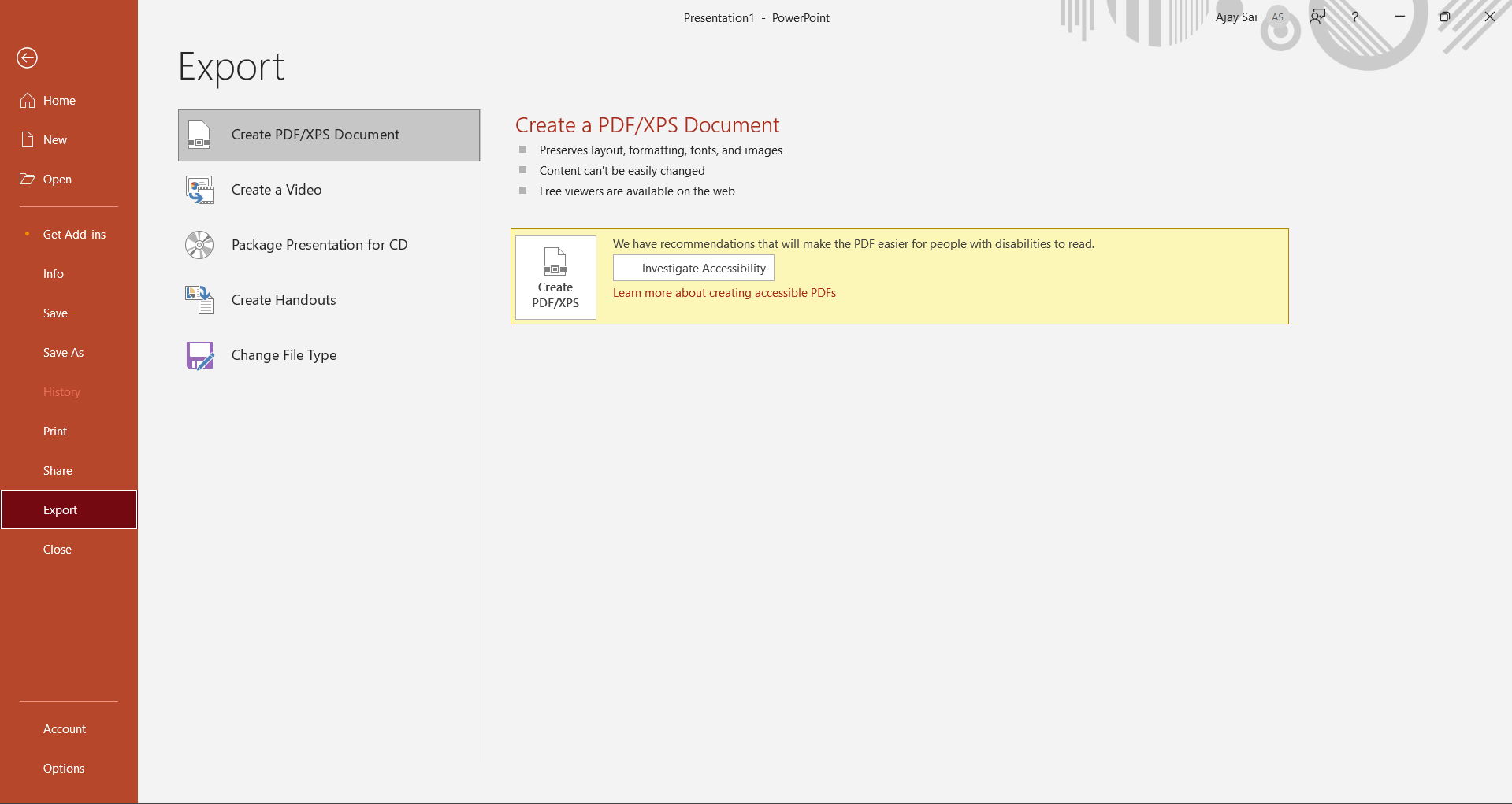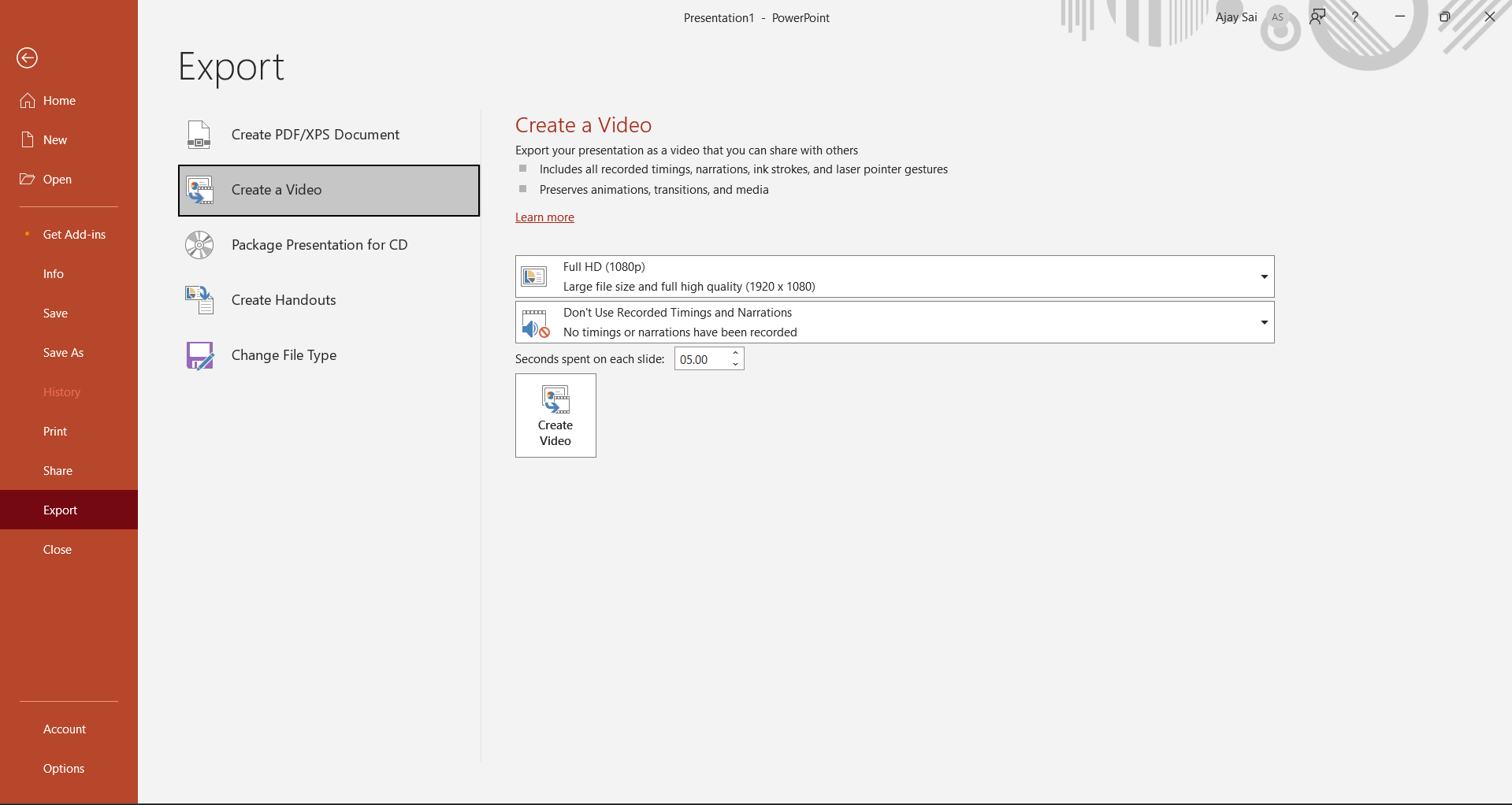 - Click on "Export" in the left-hand pane, then select "Create a Video" to begin the transformation.