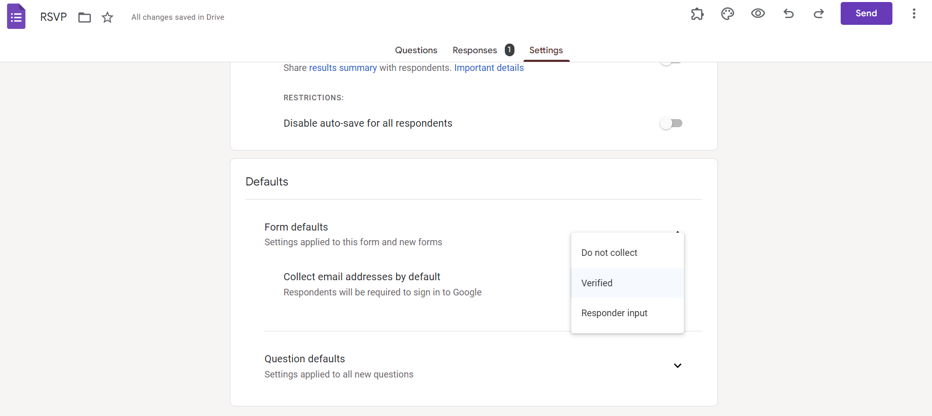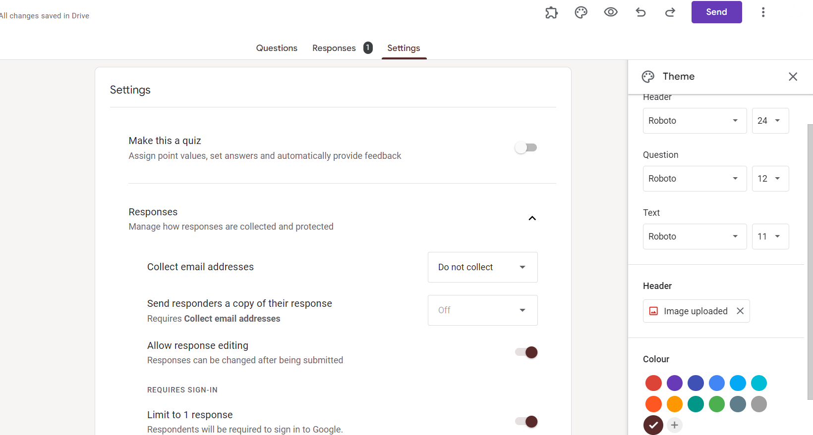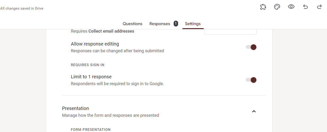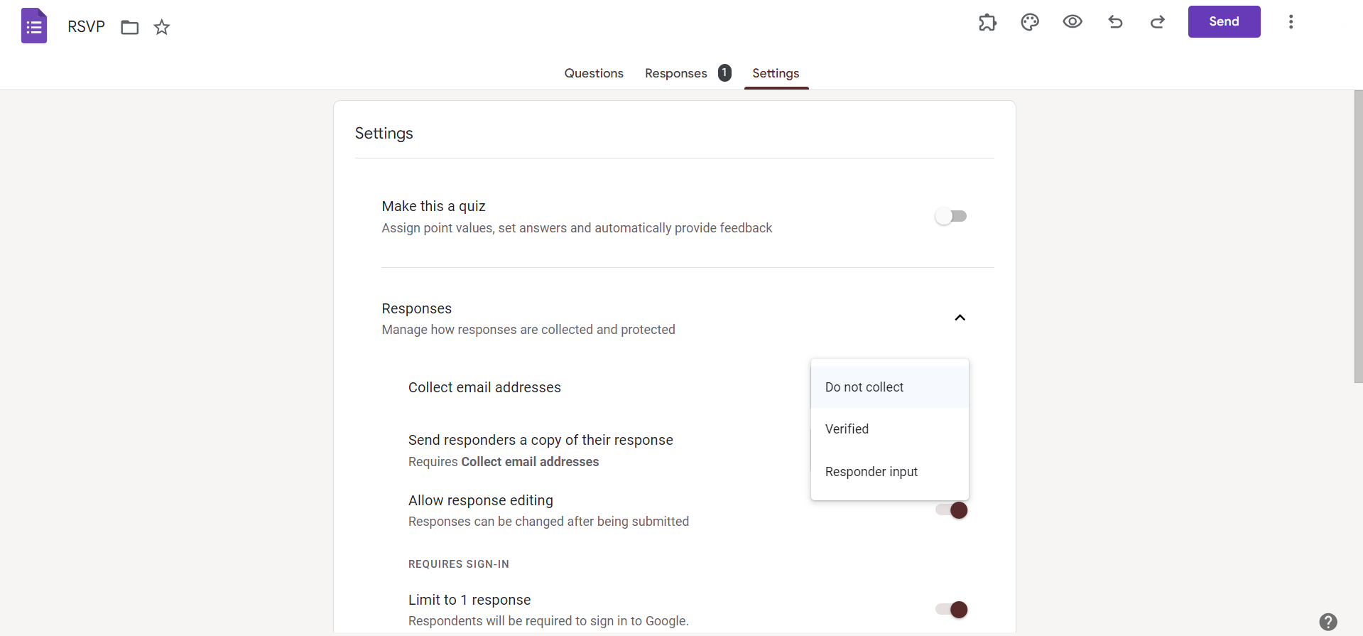 Determine whether respondents can submit one or multiple responses. For sign-up sheets, choosing "Collect email addresses" is often helpful for communication.